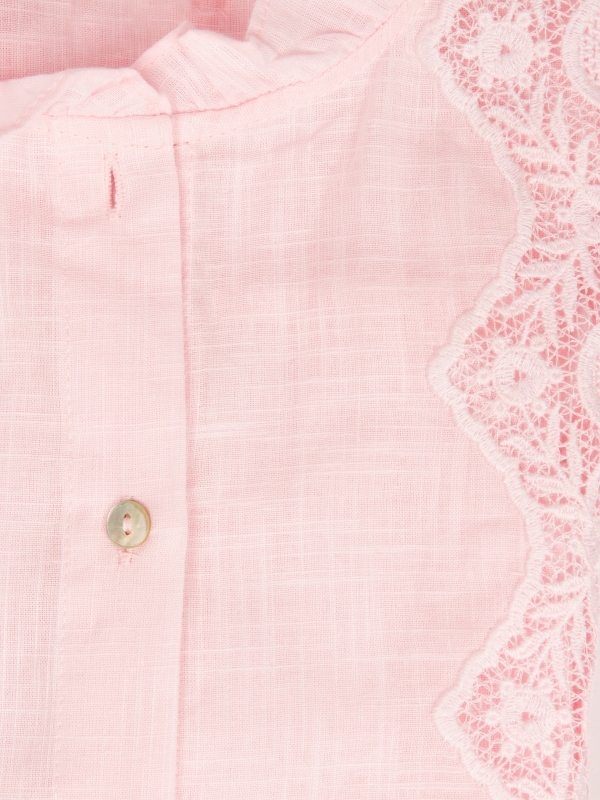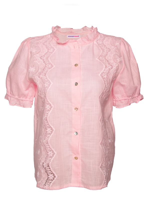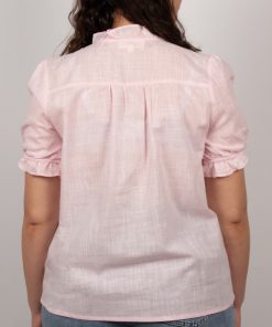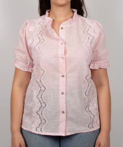 Invite softness and poetry into your wardrobe with this light pink embroidered shirt for women. Its regular cut and ruffled collar gently structure the silhouette, while the fine embroidery adds a touch of subtle elegance. Crafted from a lightweight, breathable fabric, it captures the essence of delicacy and ease.