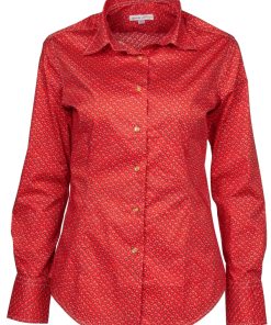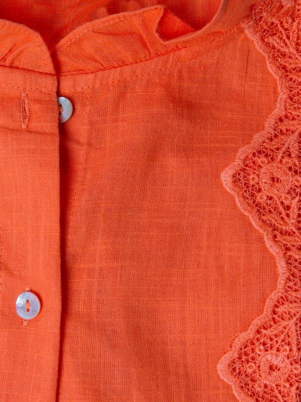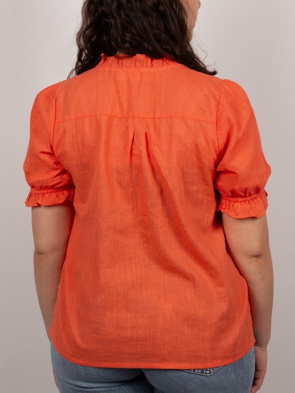 Brighten up your wardrobe with this coral-orange embroidered shirt for women. Its regular cut and ruffled collar create a confident yet feminine silhouette, while the tone-on-tone embroidery adds a subtle, refined finish. Made from a lightweight, comfortable fabric, this blouse stands out with its radiant color and elegant details.