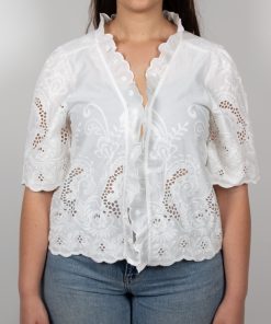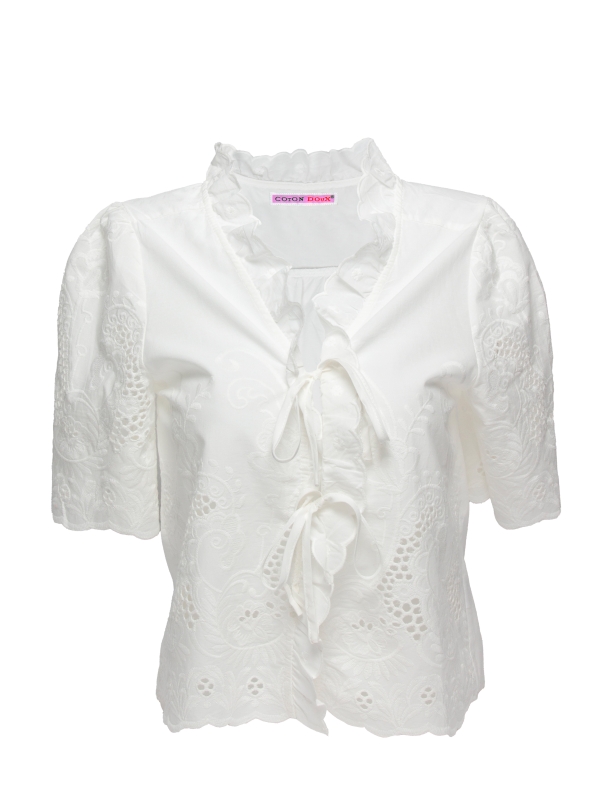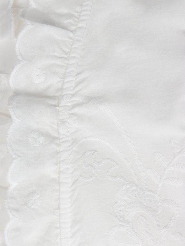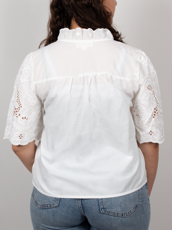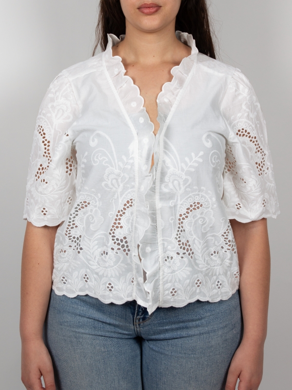 Add a touch of freshness and elegance to your wardrobe with this white embroidered shirt for women. Featuring a regular cut and a ruffled collar, it effortlessly blends romantic charm with timeless style. The delicate embroidery brings a handcrafted feel, adding a unique, refined detail. Made from a lightweight and comfortable fabric, it offers everyday ease with a sophisticated twist.
