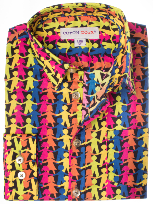 Awake the spirit of fellowship in your child with this “farandole” printed shirt. Make this shirt will loose fit one of the highlights of your child’s wardrobe, be it a girl or a boy. Its multiple colors will look great with a pair of jeans and sneakers. Another plus? The soft collar and double-button cuffs.