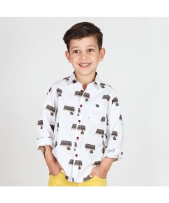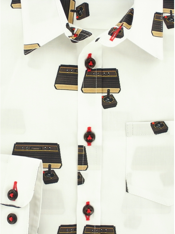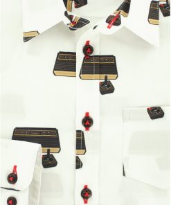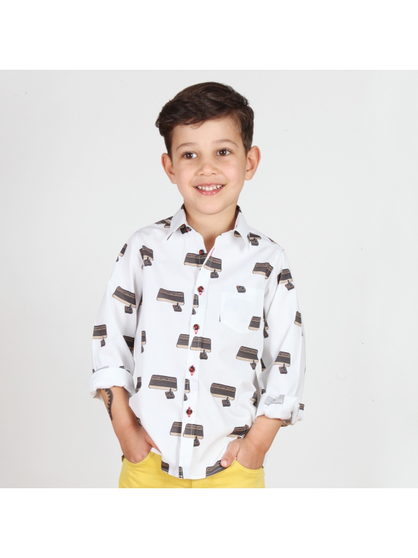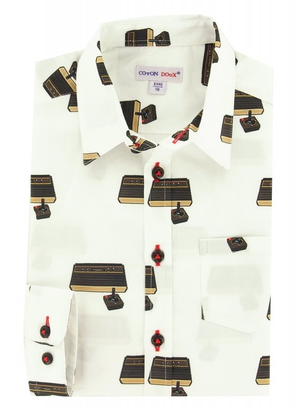 Boys will love this cotton shirt with vintage games console prints in a geek style. With its little collar, its simple two-button cuffs, its patch pocket on the chest and its close-fitting cut, it is perfectly in tune with today’s styles.