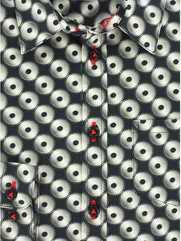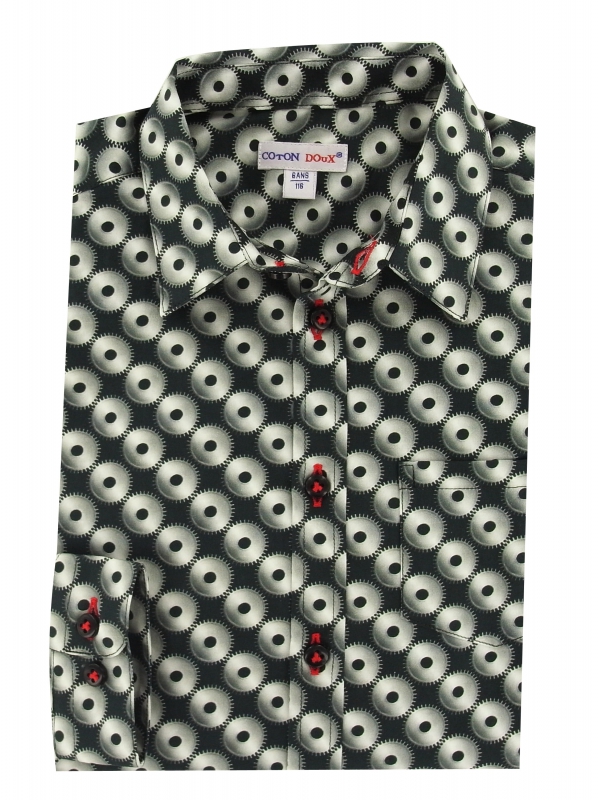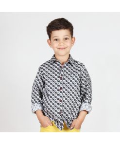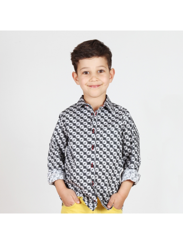 A CD print that has style for this black and grey shirt that’s elegant and modern, thanks to which your child will necessarily be trendy. Its little collar, its close-fitting cut, its patch pocket and its two-button cuffs decorated with red overstitchings give it the final trendy touch.