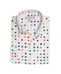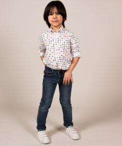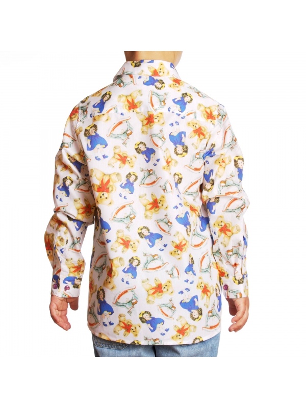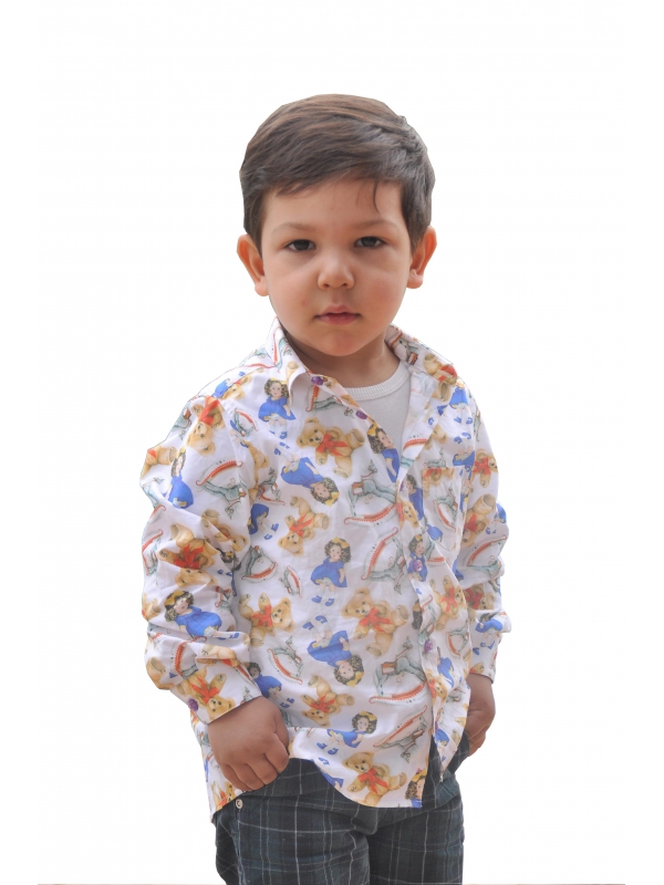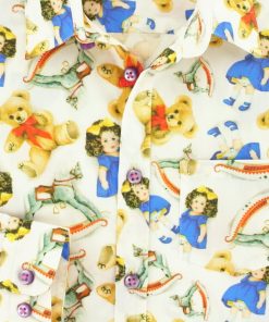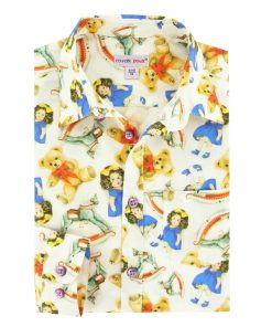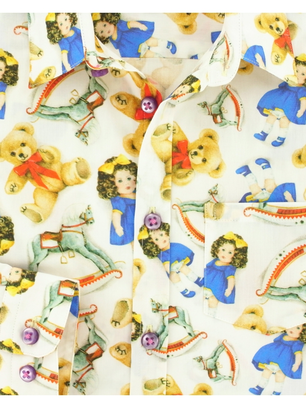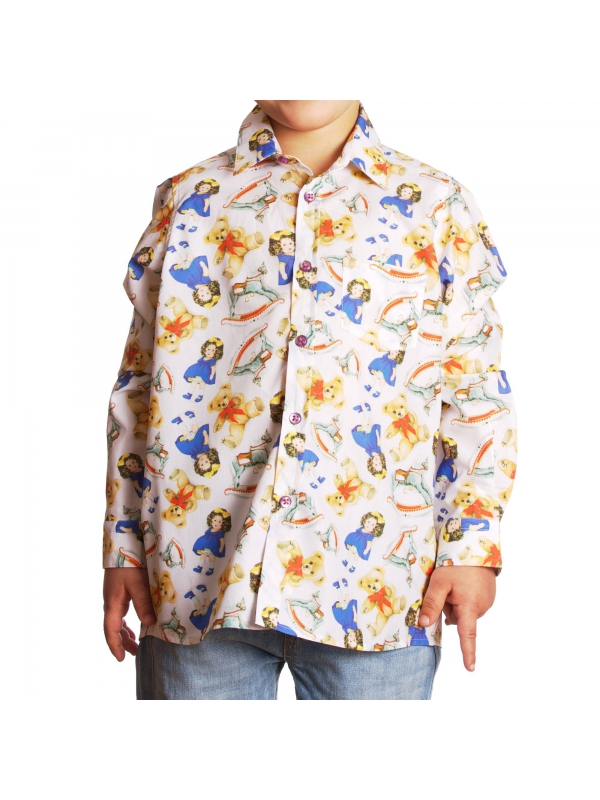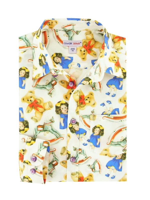 Romantic children will wear this adorable shirt with old toy pictures. Very chic, with its little collar, its contrasting buttonhole and its double-buttoned cuffs, it will go wonderfully well with white trousers this summer.