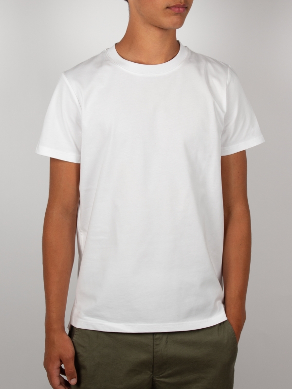 Effortlessly simple, endlessly versatile, this basic white T-shirt is the kind of piece every wardrobe deserves. Cut from 100% mercerized cotton, it combines a clean, structured fit with a naturally silky feel. Subtle yet considered details like the ribbed crew neck, side-slit hem, back neck yoke, and double-needle stitching add just the right touch of refinement. A quiet essential that goes with everything and lasts.