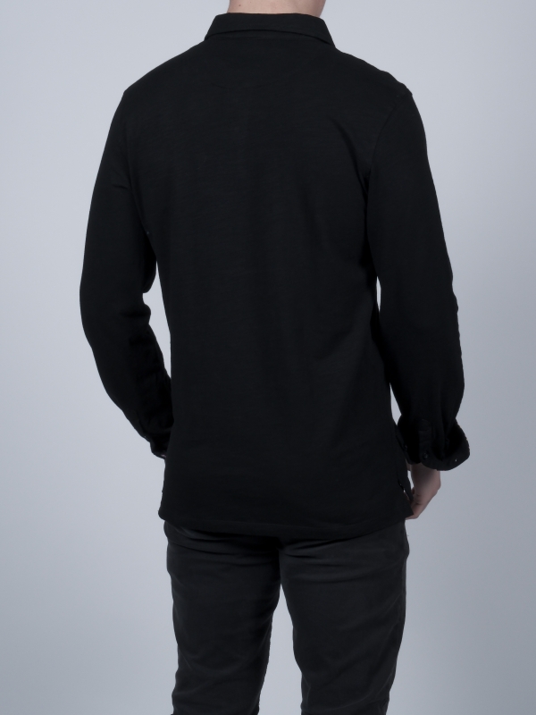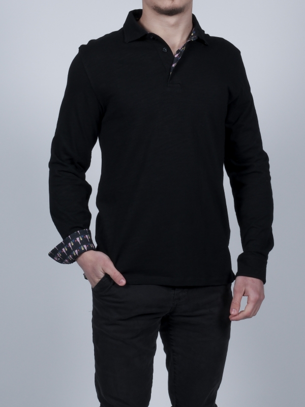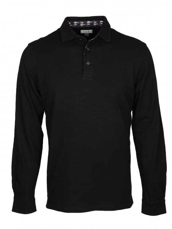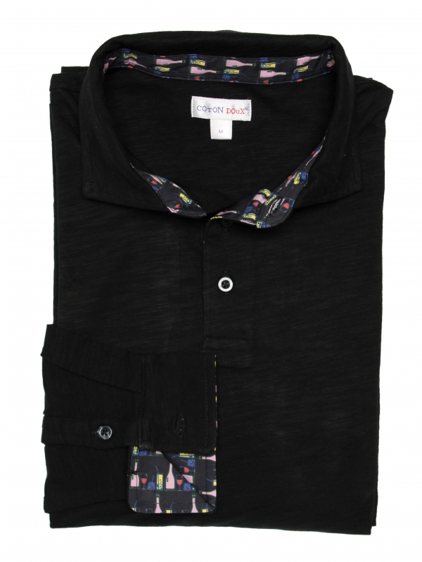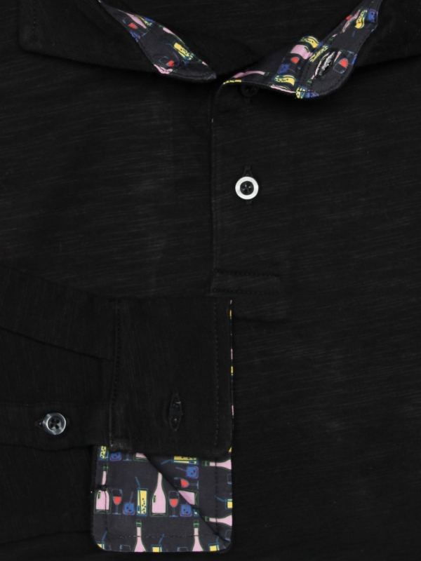 Are you a fan of aperitifs and good drinks? This black long sleeves polo shirt in pure cotton with a drinks motif will be your best ally. The drinks print hidden under the cotton piqué collar and the two-button placket will seduce many a partygoer. Its slim fit and double button cuffs will ensure you have a great night out. So go for it! Wear it without moderation with black jeans and a small red scarf for a total black casual look.