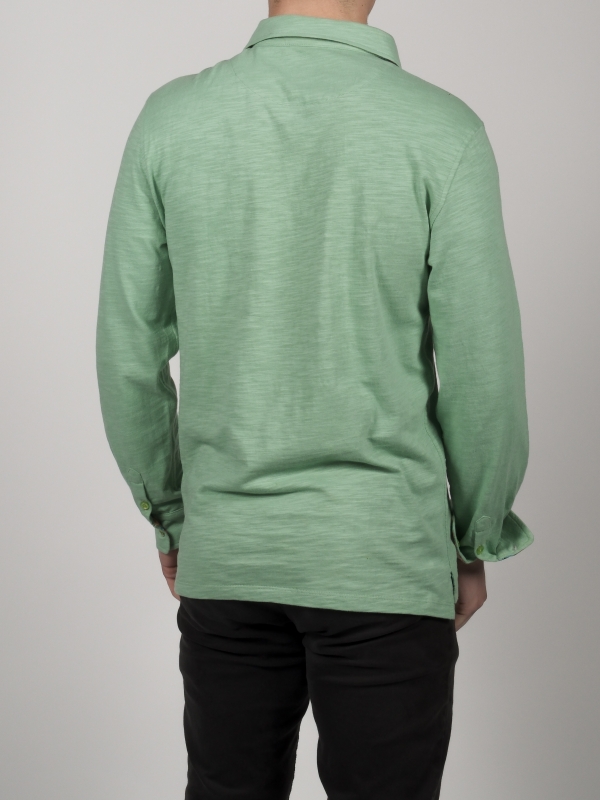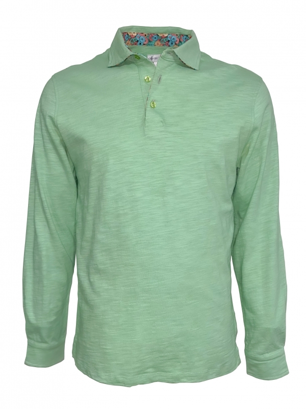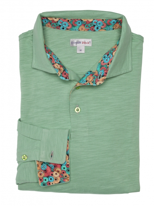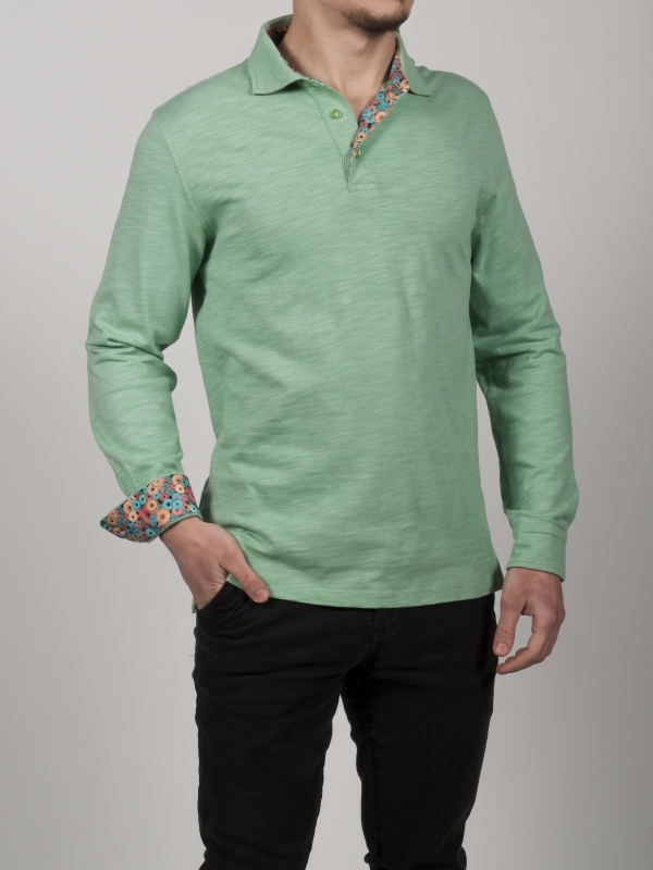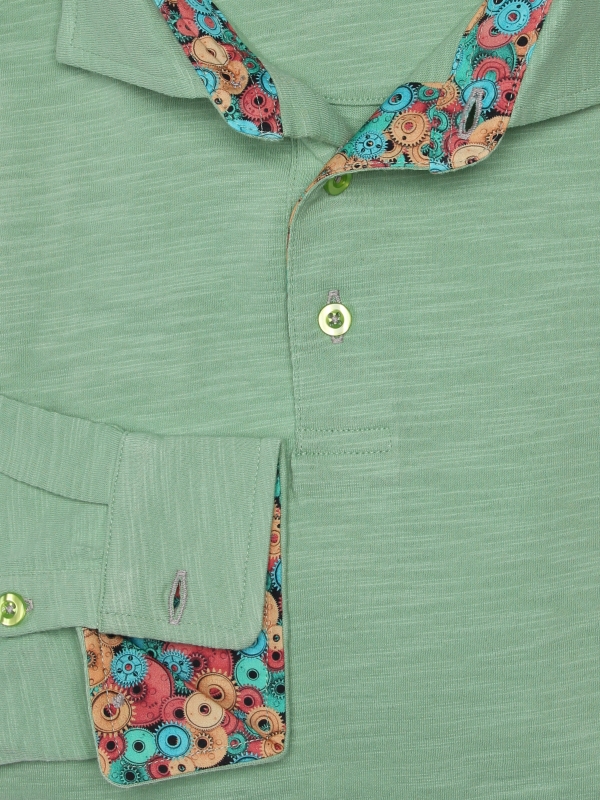 With this emerald green long sleeves polo shirt in pure cotton with machinery inner lining print, there’s no danger of losing inspiration. Just keep putting oil in those cogs, which are found in the cotton piqué collar and two-button placket to keep you on track. The slim fit and double button cuffs will ensure an undisturbed day. You can accessorise with a watch to add to the detail. This is how you can be stylish and serious at the same time.