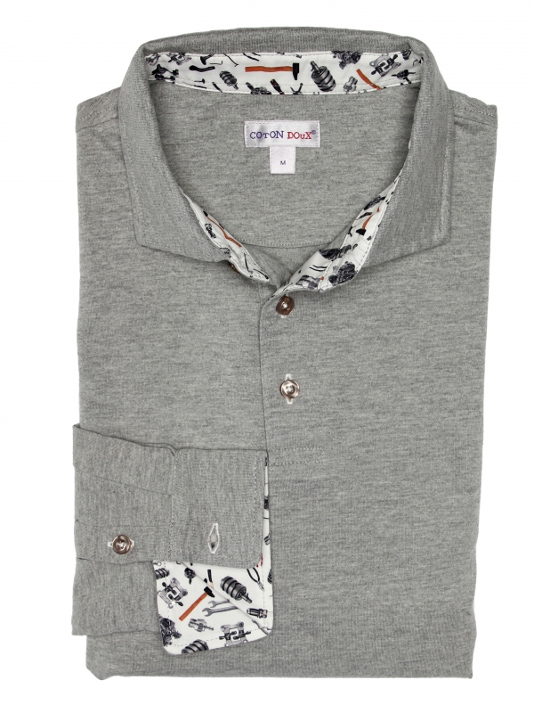 The complexity of mechanics will no longer hold any secrets for you. The tools inner lining print will be placed intimately inside the cotton piqué collar of this pure cotton long sleeve polo. The double button cuffs will be here to give you ease in your manual activities. The grey colour is said to be synonymous with softness, and will be present throughout your fitted cut. To accentuate the delicacy of the two-button placket, navy blue suit trousers will be preferred.