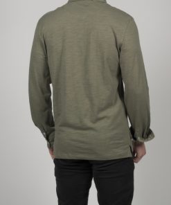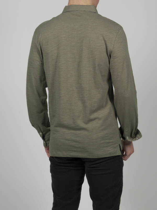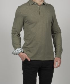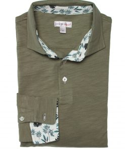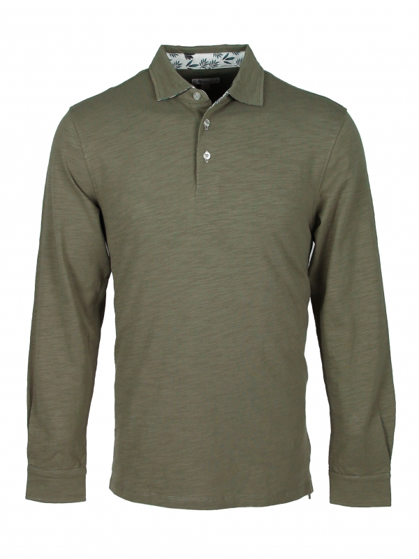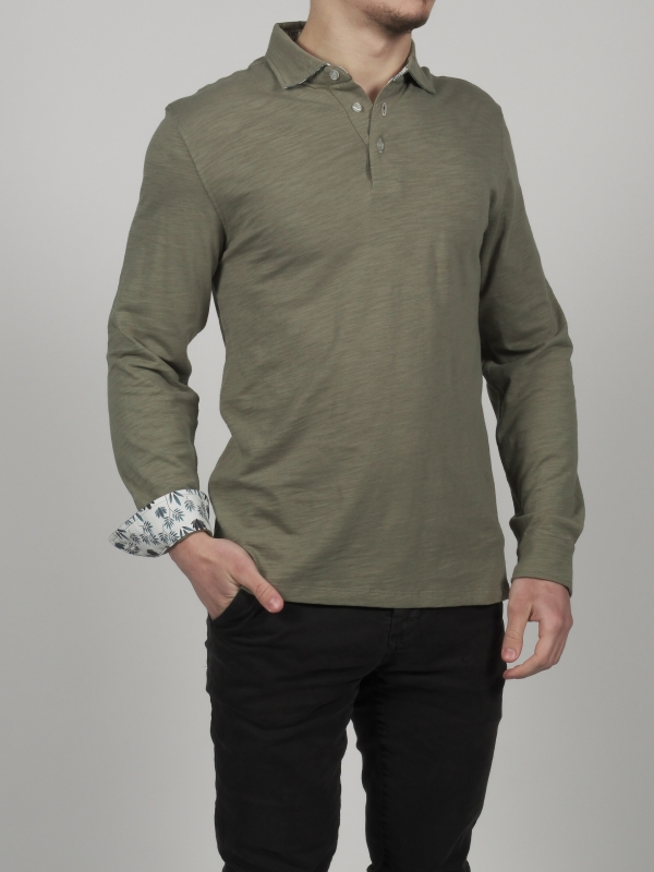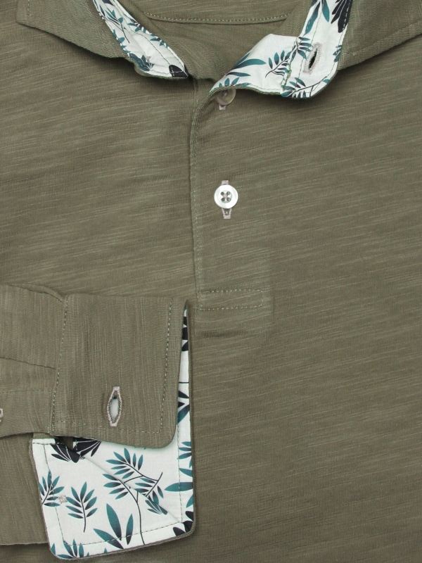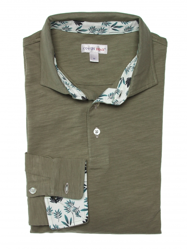 This khaki green long sleeves polo shirt with foliage inner lining print will make you tingle with happiness. Its soft hue and pure cotton composition are a call to meditation. The foliage then takes shape in the cotton piqué collar, while the two-button placket is a source of lightness. With your slim-fitting polo shirt and double button cuffs, take a break and watch the greenery take over. Grey trousers and matching loafers can also accompany you during this stop.