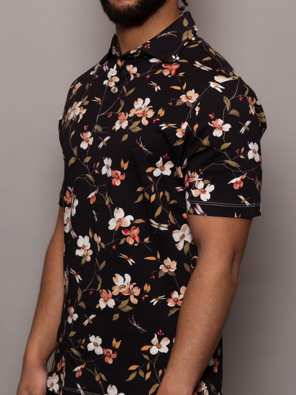 Intricate and elegant, our Dragonflies Polo features delicate dragonflies on a deep black background, creating a refined, modern design. Made from mercerized cotton jersey, it offers supreme softness and breathability. The cotton piqué collar enhances its elegance, while the regular fit flatters the silhouette. Finished with a two-button placket, this polo blends subtle luxury with nature’s poetry.