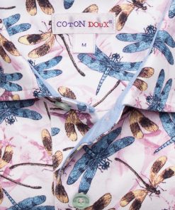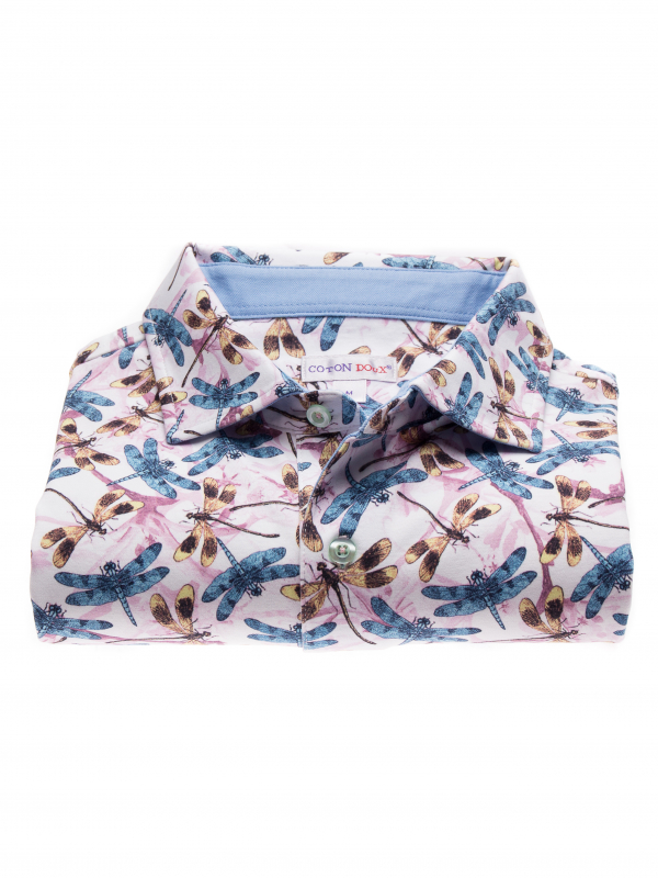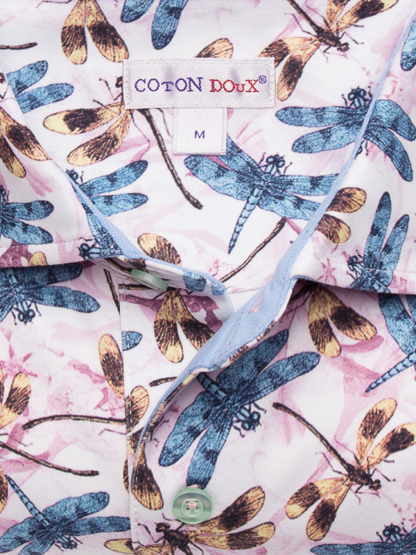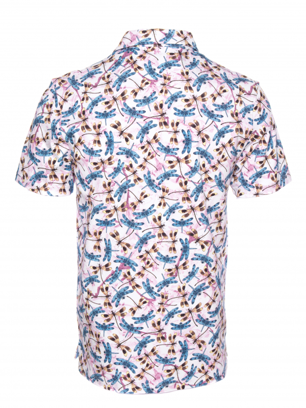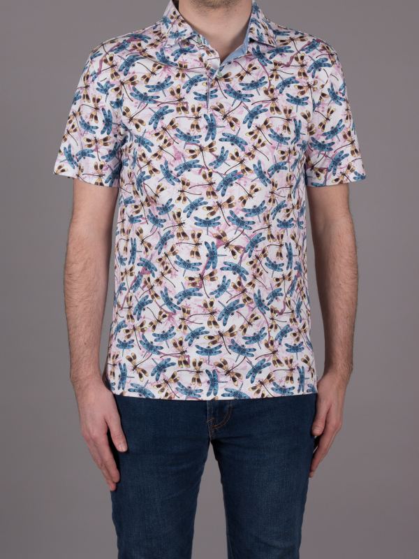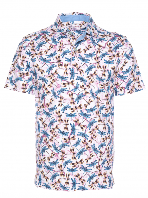 Dragonflies are back this summer, dare to wear this polo shirt dressed with those pretty yellow and blue insects! The softness of its cotton jersey and its two-button placket are perfect for beautiful sunny days. The cotton piqué collar adds extra charm to this new must-have. Wear it with a light chino and espadrilles, summer effect assured!