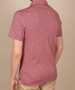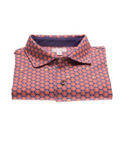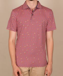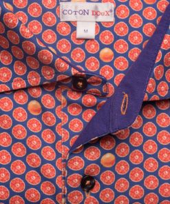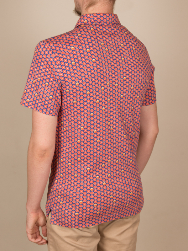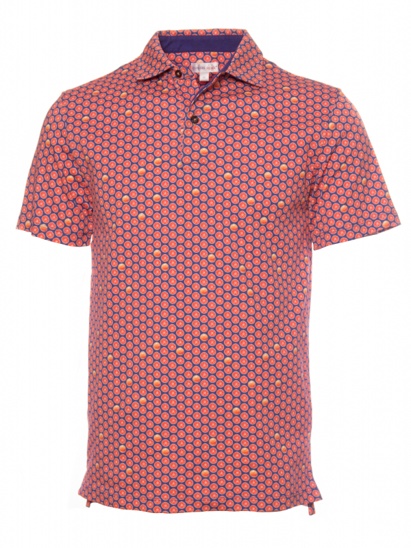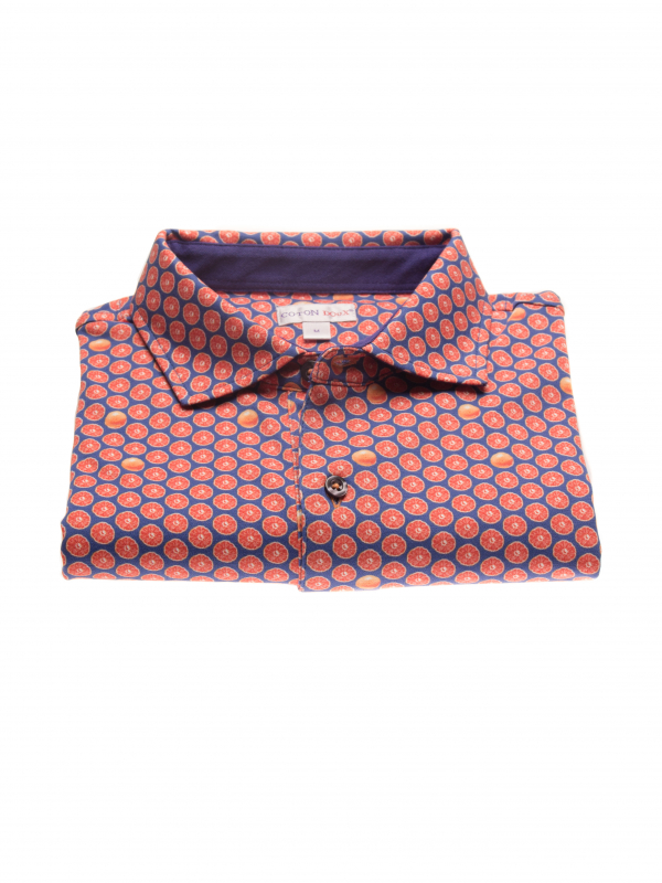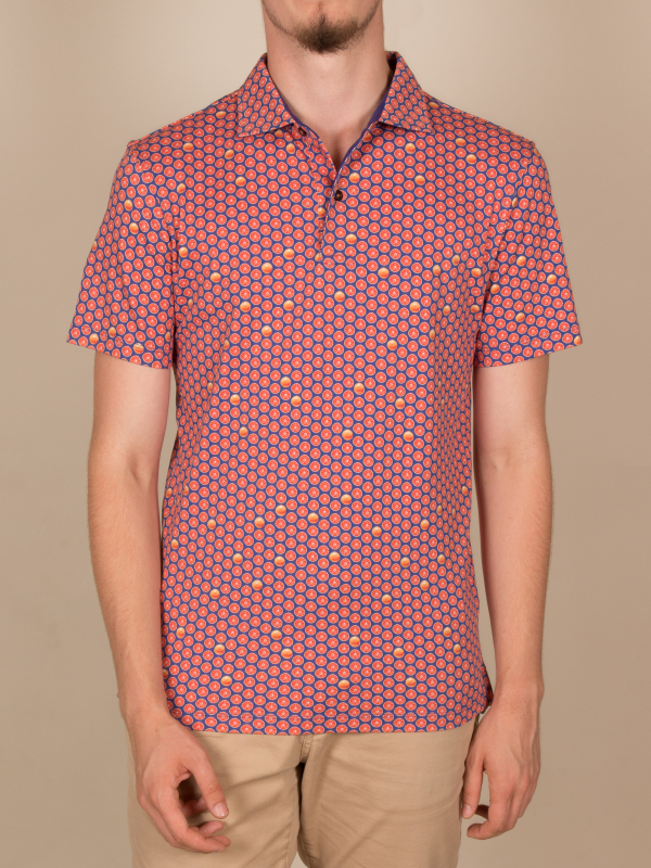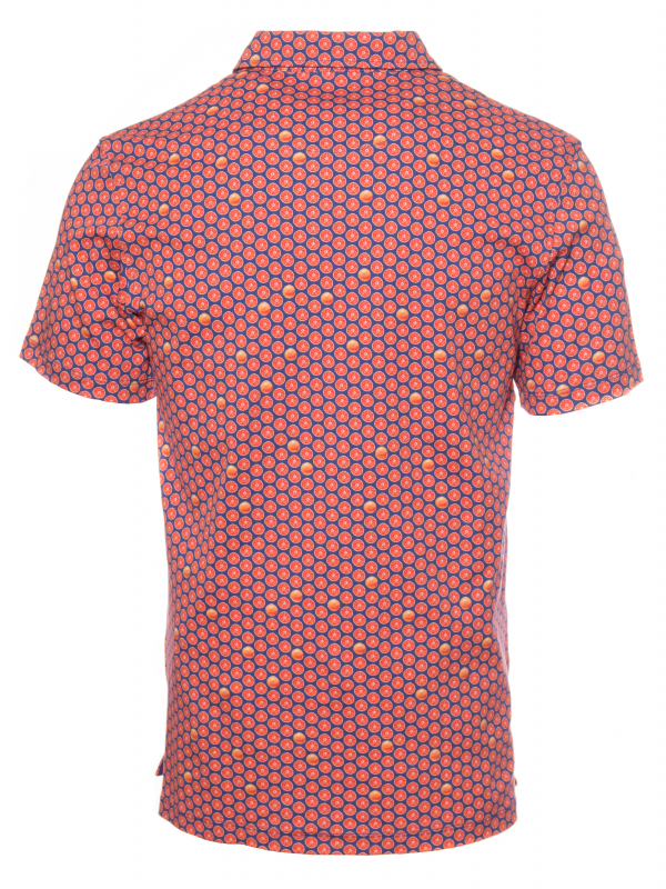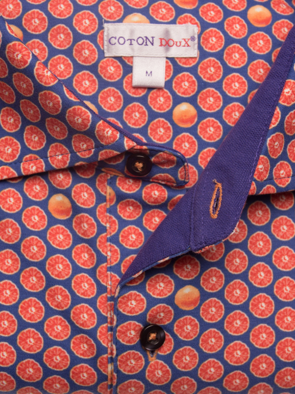Fill up on vitamin D for the summer with this grapefruit printed polo shirt! Its mercerized cotton jersey composition and short sleeves will provide you the comfort you need, while the two-button placket will provide a touch of distinction to your outfit. Its plain piqué cotton collar, matching the blue background of the print, will be perfect with jeans and white sneakers.