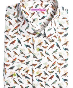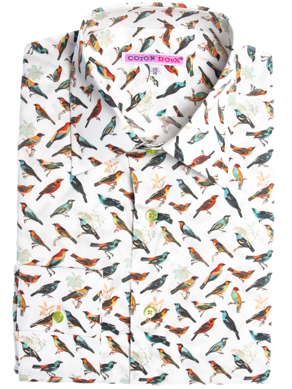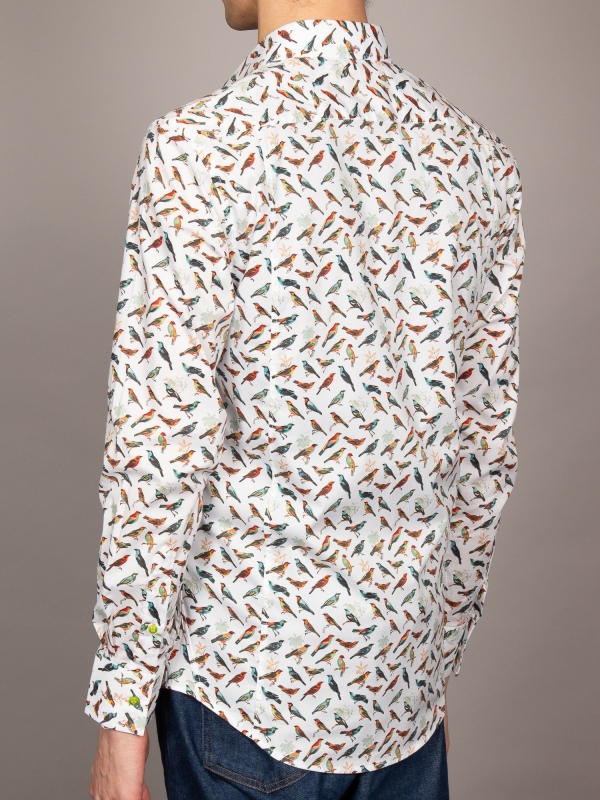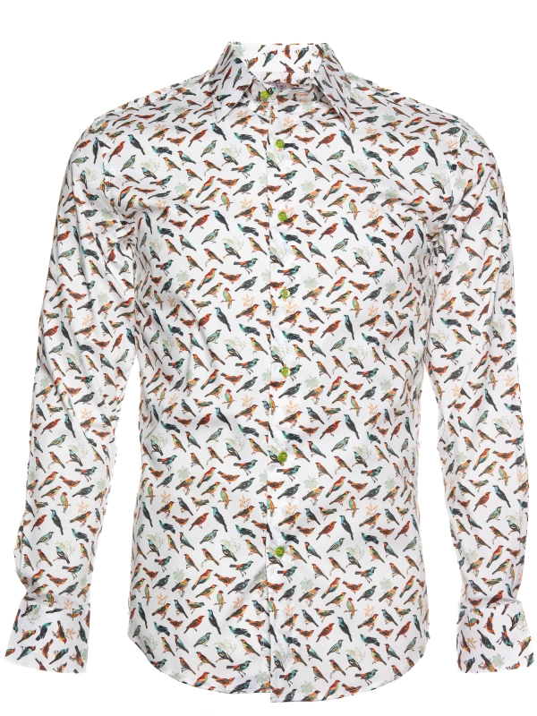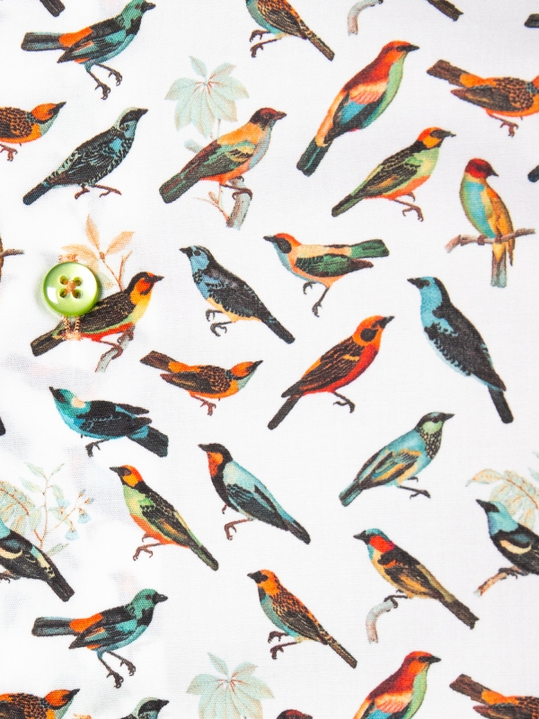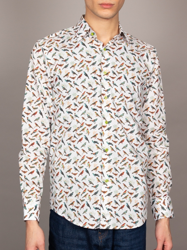 Unleash your inner freedom with this shirt featuring a stunning bird print that flutters across a pristine white backdrop. Each bird adds a dynamic and lively spirit to your ensemble. The Milanese collar and single cuffs offer a sharp contrast. Perfectly paired with dark denim or chinos, this shirt effortlessly combines nature’s beauty with contemporary style, ensuring you stand out with every step.