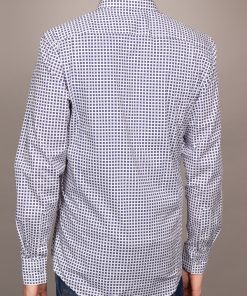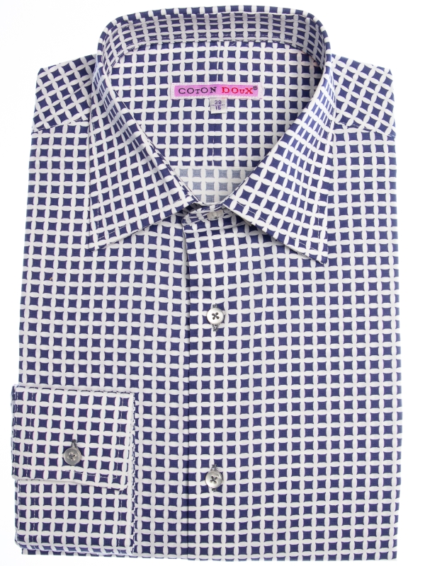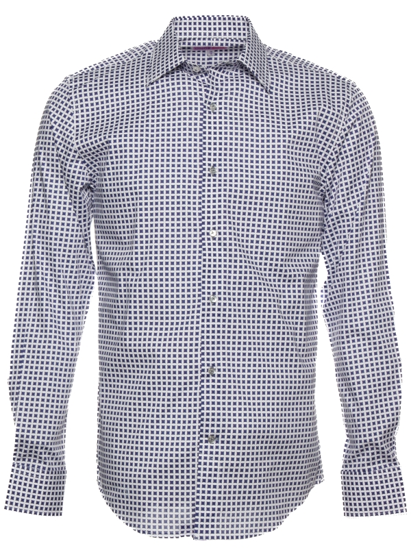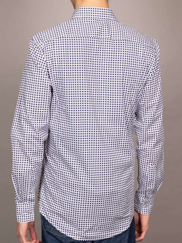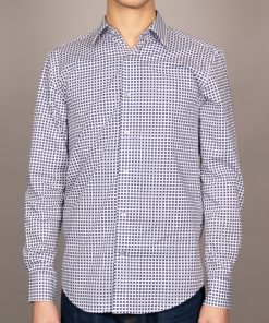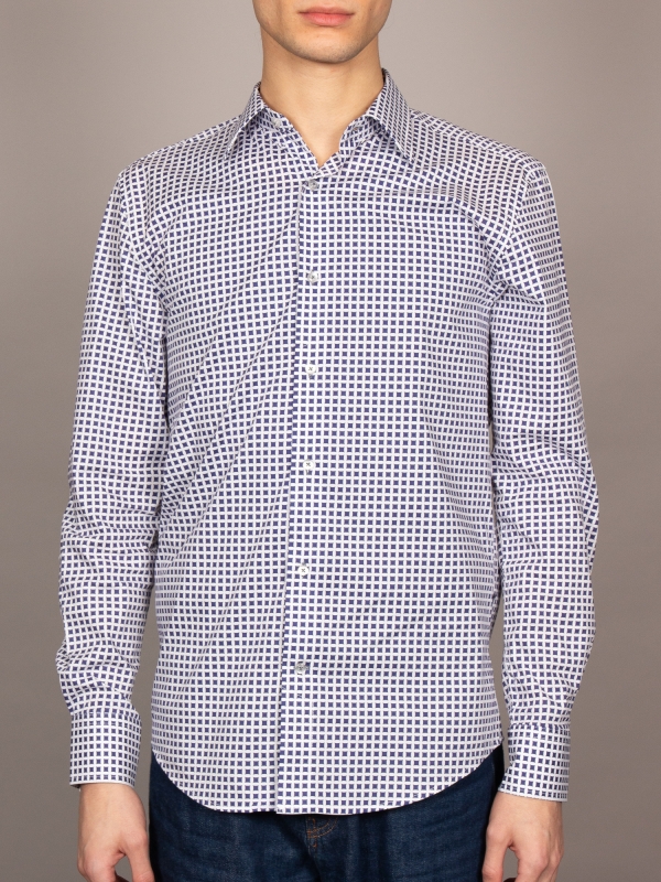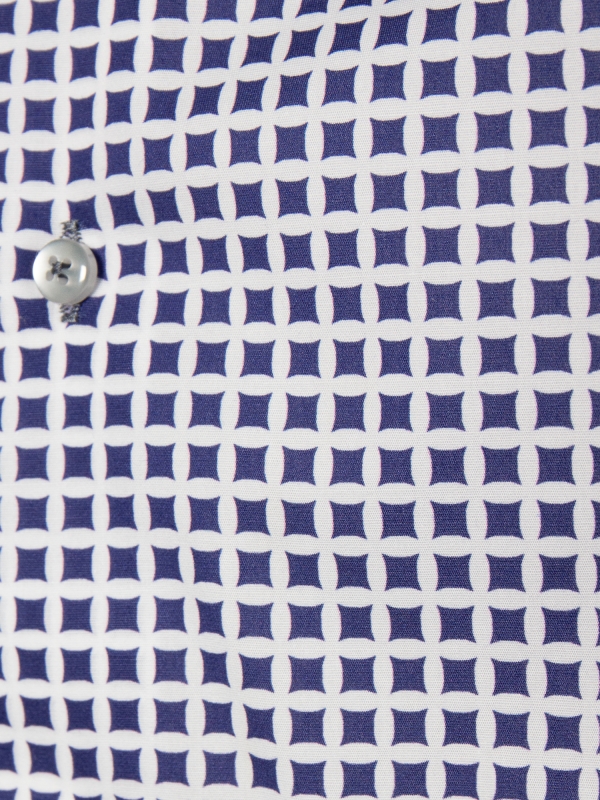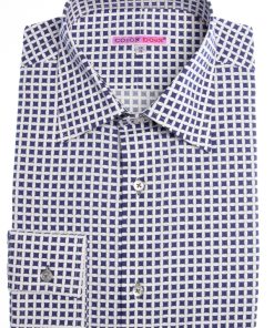This shirt transforms simple geometry into a statement of style, with bold blue squares set against a pristine white backdrop. The pattern feels fresh and dynamic, yet effortlessly refined. The Milanese collar and single cuffs add a crisp, tailored finish, while the regular fit ensures comfort throughout the day. A perfect blend of modern flair and timeless appeal, this shirt pairs seamlessly with chinos, bringing a dash of artistic flair to any outfit.