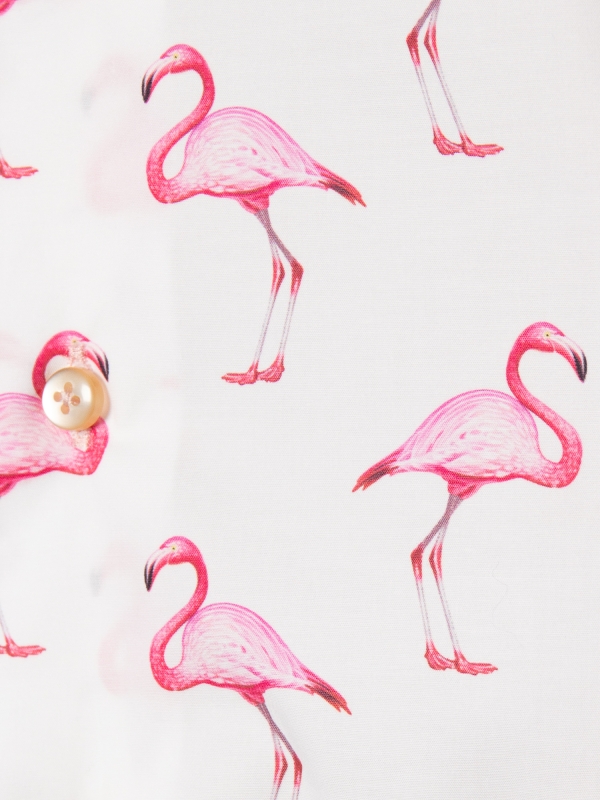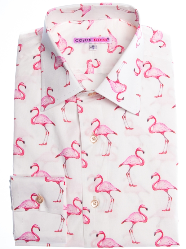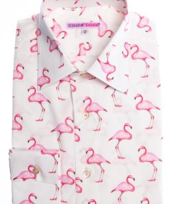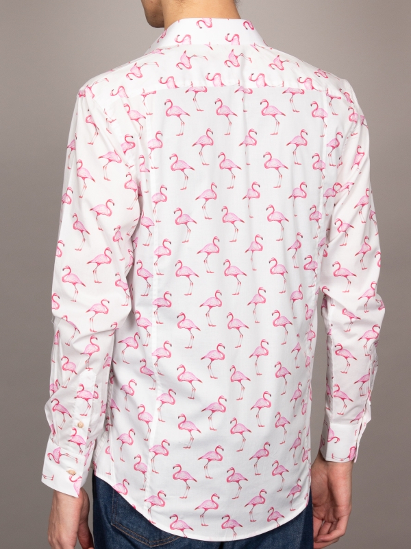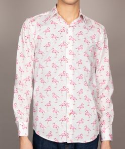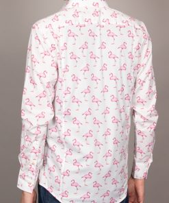 Bring a splash of tropical flair to your wardrobe with this shirt, featuring a bold flamingo print on a crisp white background. The vibrant flamingos, standing tall and graceful, offer a playful contrast to the clean, bright fabric. With its Milanese collar, single cuffs, and regular fit, this shirt delivers a sharp yet relaxed look. Pair with light trousers for a laid-back, eye-catching outfit that captures the essence of summer.