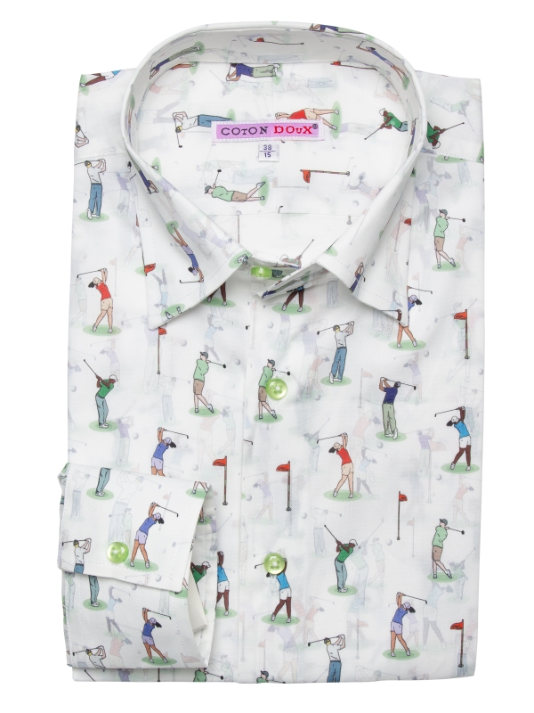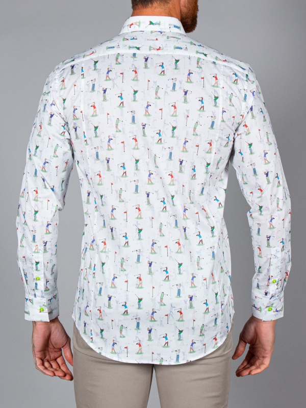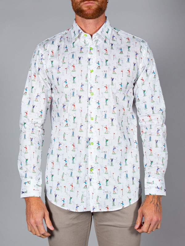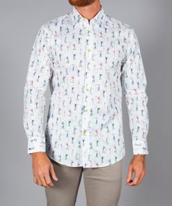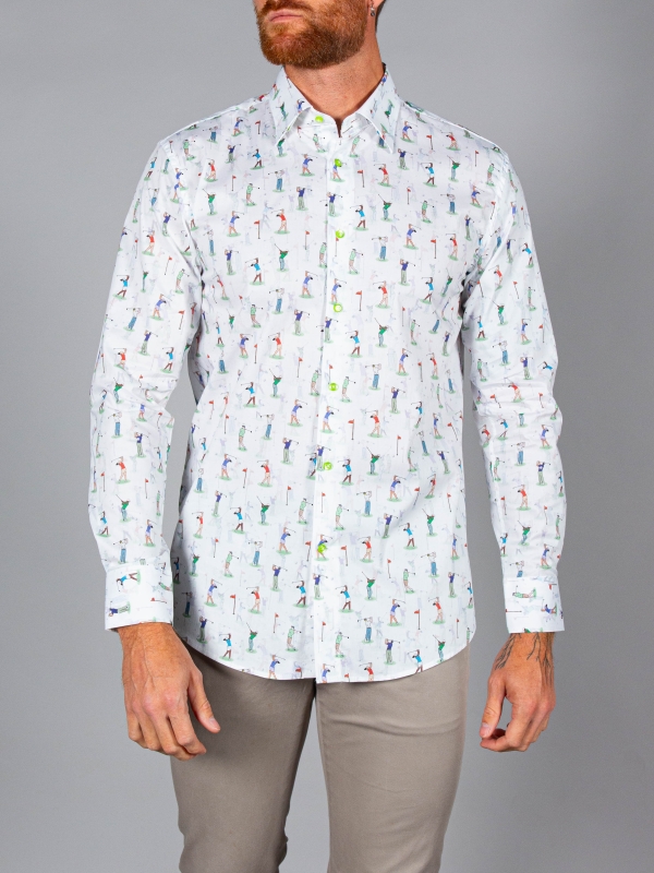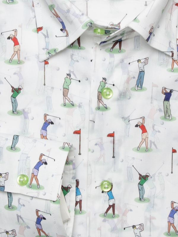 Don’t hit the green without your golf print shirt! With its simple cuffs and regular fit, you’ll be ready to perfect your swing and stand out on the course. The Milanese collar pairs effortlessly with classic beige trousers and a stylish visor, making it a versatile choice for both public and private rounds. Whether you’re aiming for a hole-in-one or just enjoying the game, this shirt has got you covered!