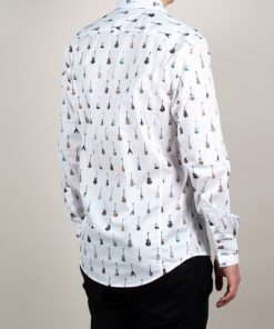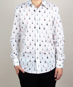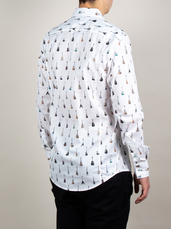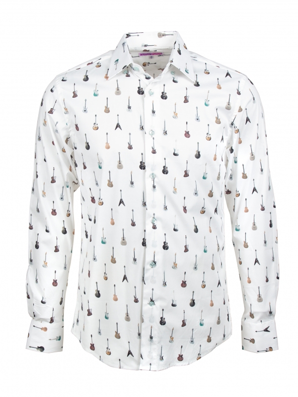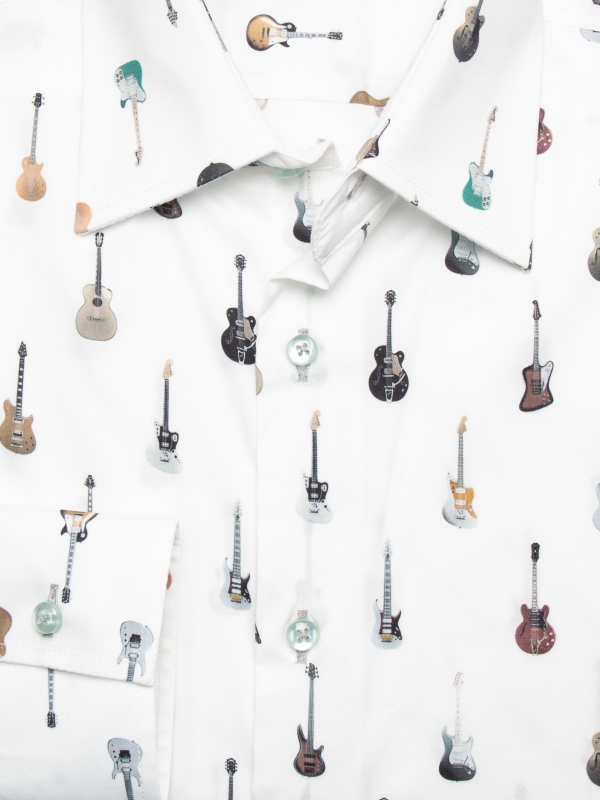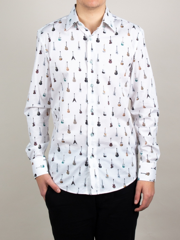 In a tribute to musical passion, this men’s shirt features an intricate guitar print, a symphony of style. The regular fit offers both comfort and a classic silhouette, accentuated by the Milanese collar, a hallmark of timeless elegance. Simple cuffs complete the ensemble with a clean and unfussy finish.Try to pair this shirt with a well-fitted indigo denim jeans and brown suede desert boots. This ensemble exudes an air of refined casualness, perfect for a casual night out at a music club or a gathering with fellow music enthusiasts.