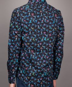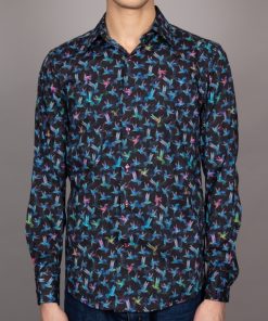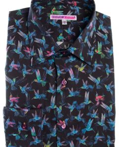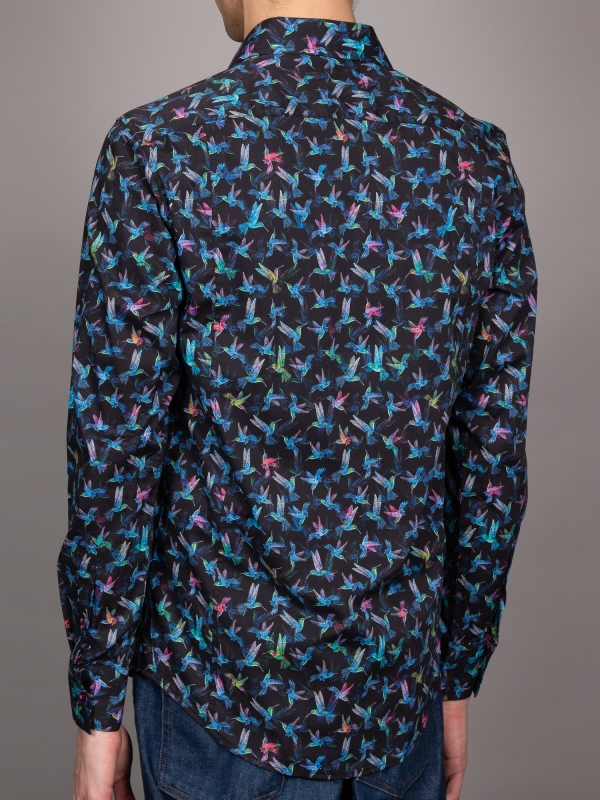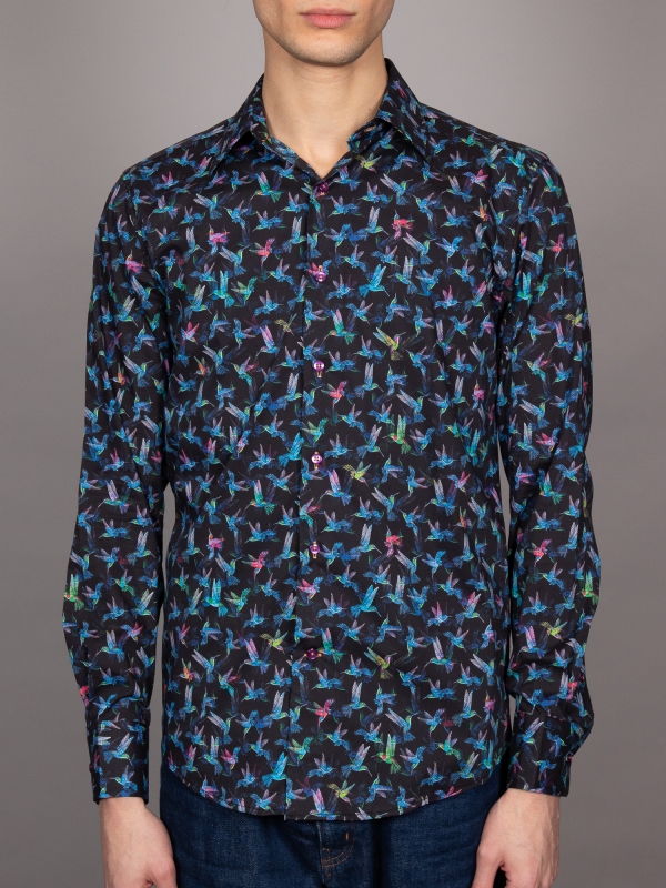Soar into style with this shirt, featuring a striking hummingbird print in vibrant blue against a deep black background. The delicate hummingbirds, frozen in mid-flight, bring a sense of elegance and energy to the design, evoking a feeling of grace and movement. The Milanese collar and single cuffs add a refined touch, while the regular fit ensures comfort.