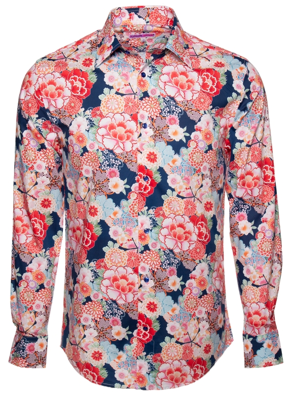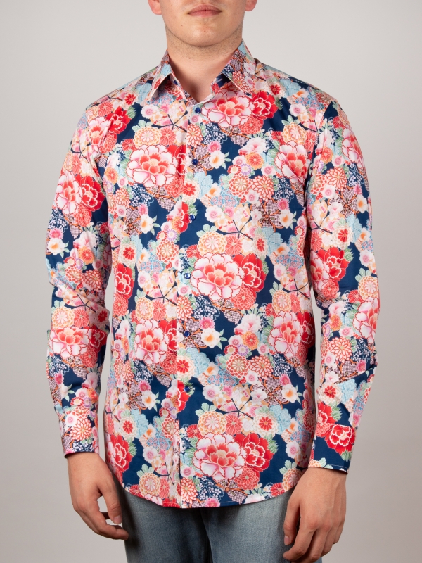Immerse yourself in the soft elegance of this Japanese floral print shirt. With a regular fit, structured Milanese collar and minimalist cuffs, it exudes sophistication. The delicate floral pattern is inspired by the serene Zen aesthetic, capturing the subtle beauty and grace of Japanese culture. An ideal choice for a refined look with poetic charm.
