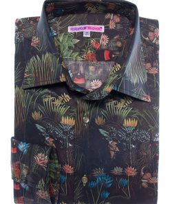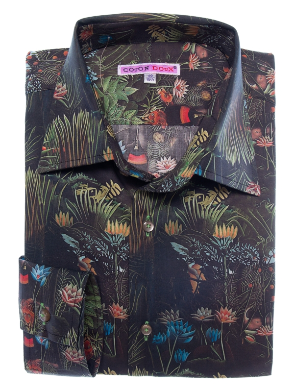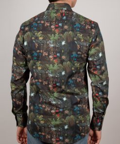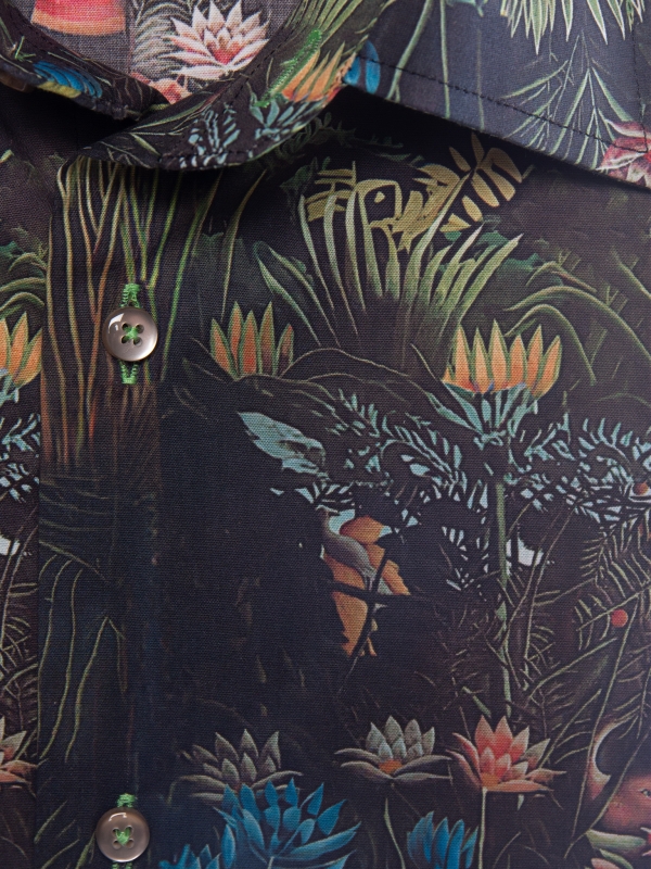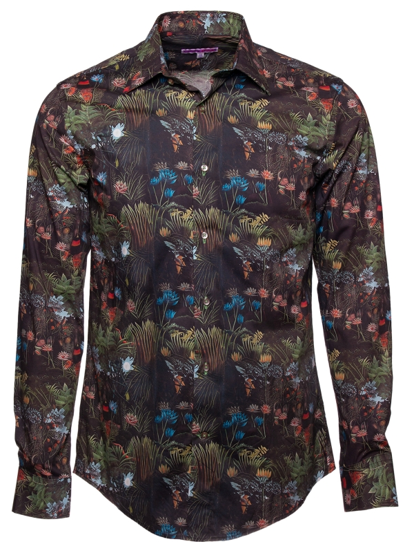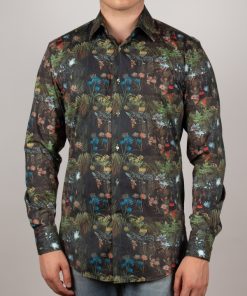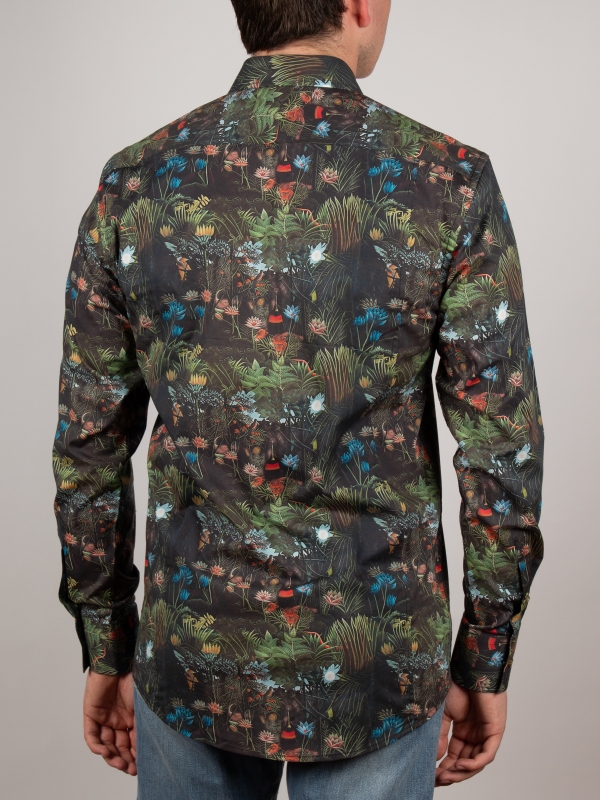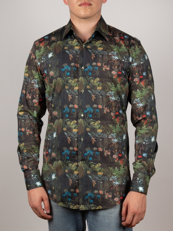 Embrace an exotic getaway with this jungle-print shirt, where bold patterns blend seamlessly with refined sophistication. Its regular cut offers a structured, modern silhouette, enhanced by a sleek Milanese collar and minimalist cuffs. Rich in intricate botanical details, the print achieves a harmonious balance of vibrancy and elegance. Perfect for those who want to showcase a daring style with grace and contemporary flair.