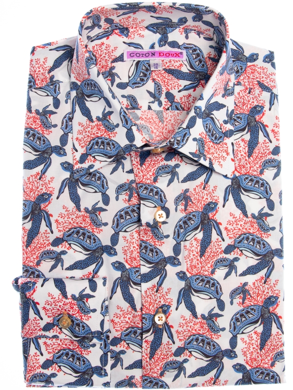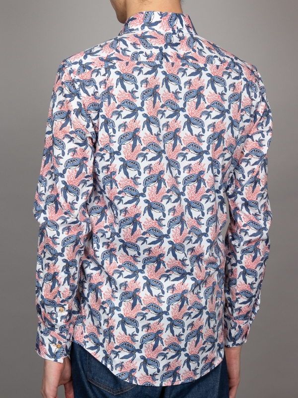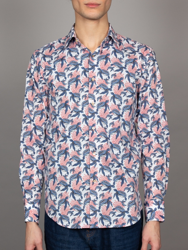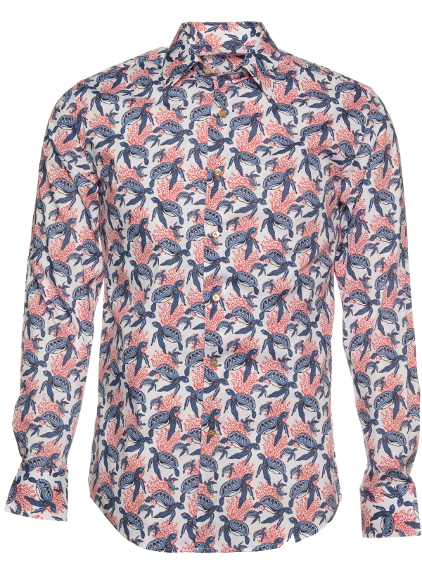 This shirt blends the serene elegance of the ocean with vibrant coral accents, featuring a playful turtle print that swims across a clean white backdrop. The harmonious mix of gentle turtles and bold coral evokes the natural beauty of the sea, capturing a moment of calm and vibrancy. The Milanese collar and single cuffs provide a touch of sophistication, while the regular fit offers relaxed comfort. Pair it with casual shorts for a look thatchannels the spirit of the ocean