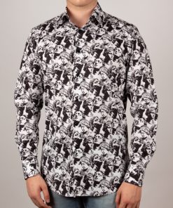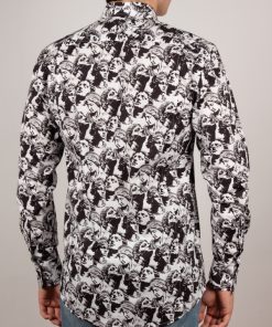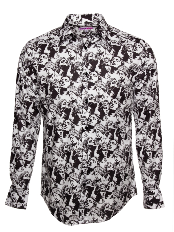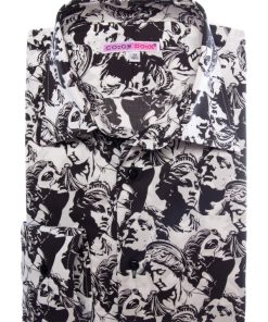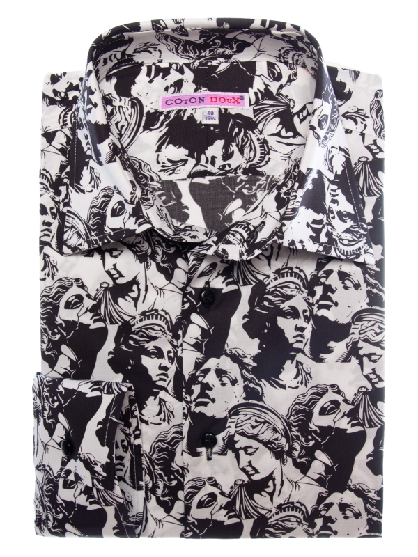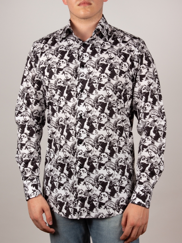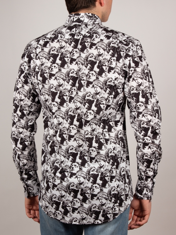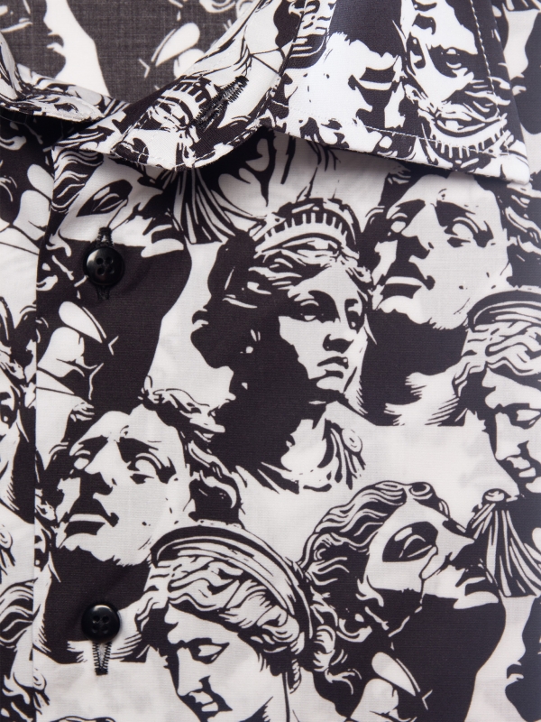 Drawing inspiration from neo-classical charm, this statue-print shirt embodies artistic elegance. The regular fit shapes the silhouette with subtle precision, complemented by a sleek Milanese collar and minimalist cuffs that add modern sophistication. Marble faces and sculpted figures adorn the fabric like a living gallery, seamlessly merging timeless antiquity with contemporary design. A standout piece for those who cherish the harmonious blend of art and fashion.