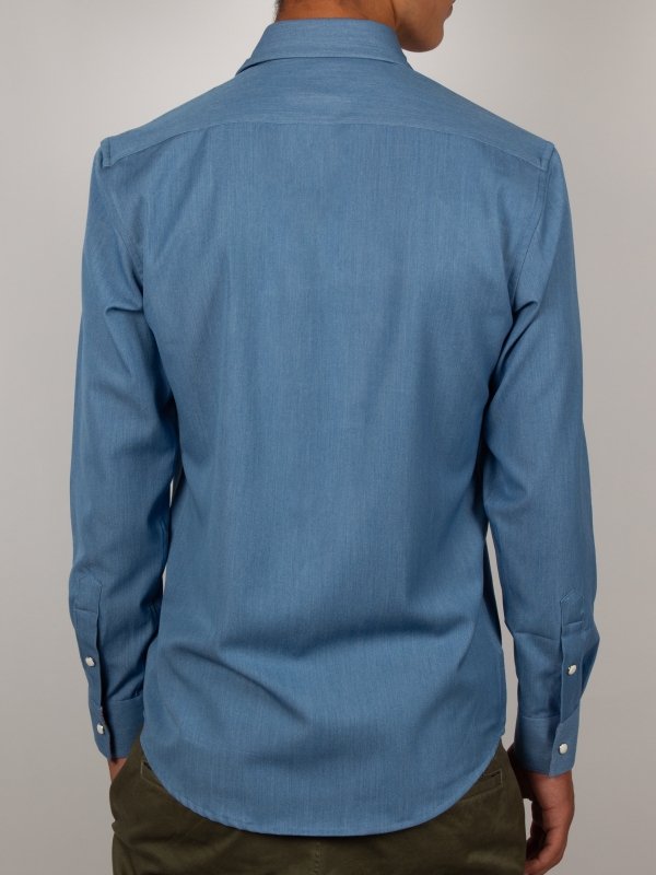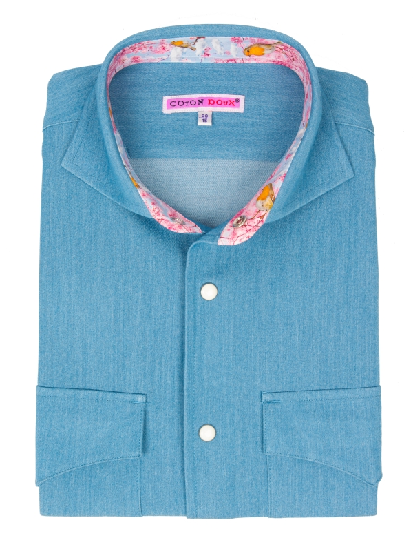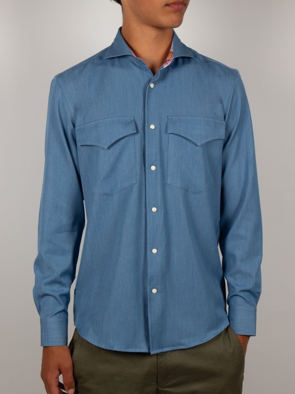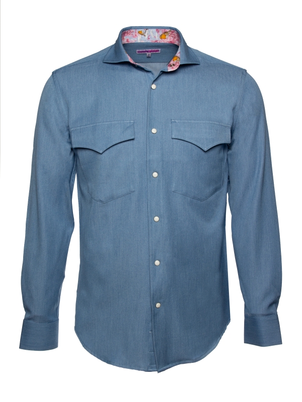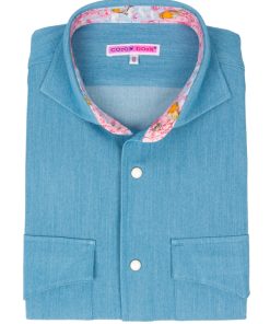 This light blue denim western shirt reinterprets casual elegance with its regular, tailored fit, bold cutaway collar, and practical snap buttons. In contrast, the cherry blossom print on the inner lining adds a delicate, floral touch a poetic nod to spring. An unexpected detail that enhances the piece with subtlety and originality.