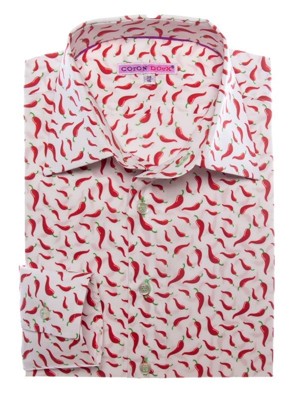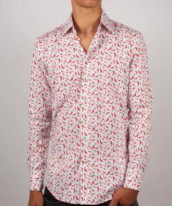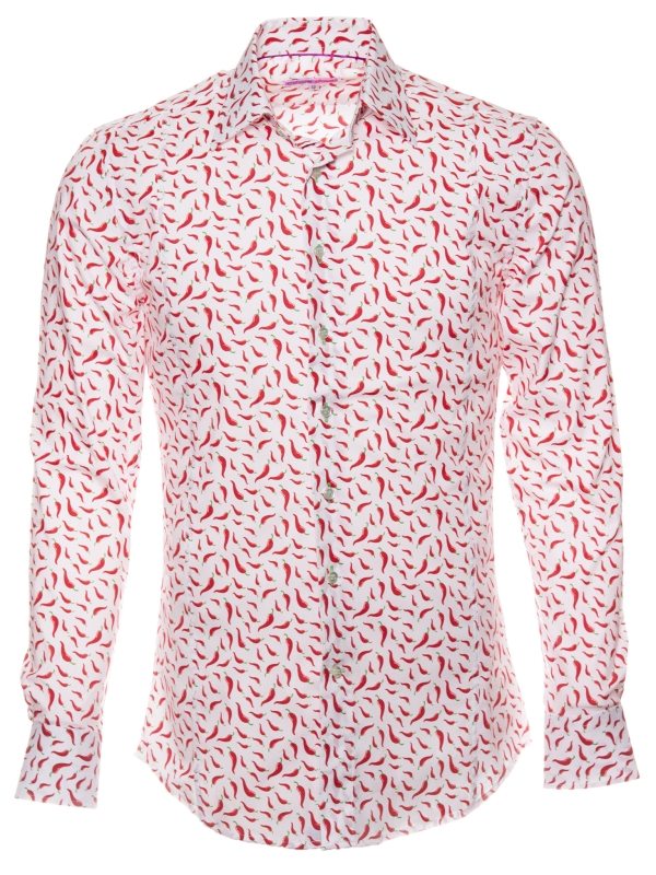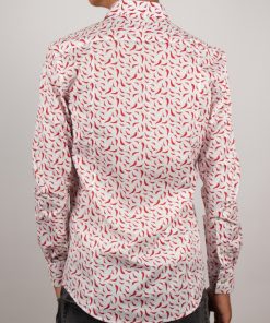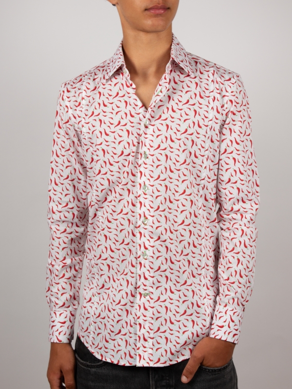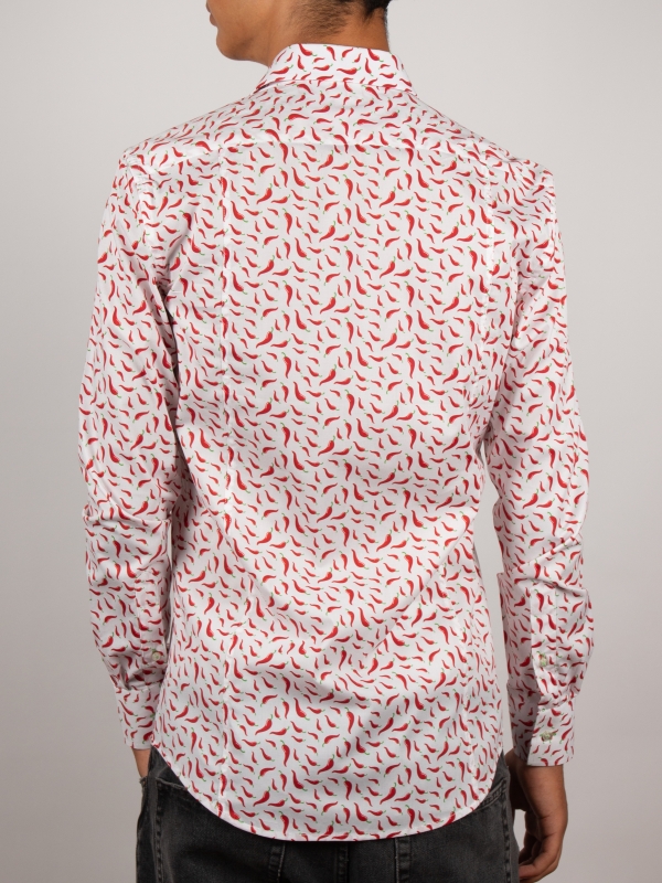 A lively breeze sweeps through this slimfitted shirt adorned with a chili pepper print, adding a dash of spice to your style. Set against a crisp white background, vibrant red chili peppers bring fresh, zesty energy. The Milanese collar and simple cuffs lend understated elegance, perfectly balancing the look. Pair it with beige pants or dark denim for a bold, sunlit outfit.