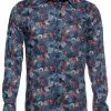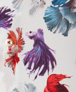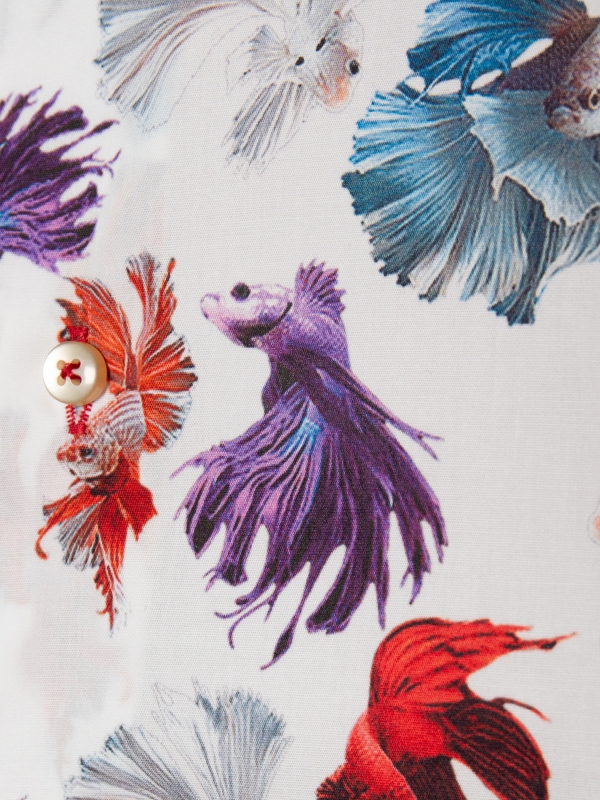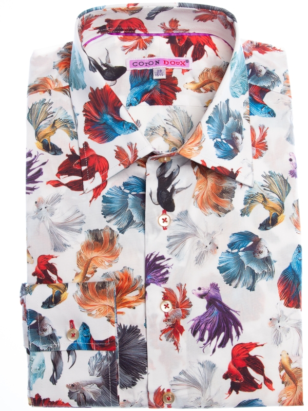 This shirt features a dynamic print of fighting fish, swimming in various shades against a clean white background. The contrast between vibrant colors and the simplicity of the white canvas creates a striking effect. With a Milanese collar and single cuffs, it maintains a refined yet playful aesthetic. The slim fit adds a modern edge, ensuring a sharp and polished look.