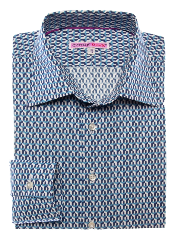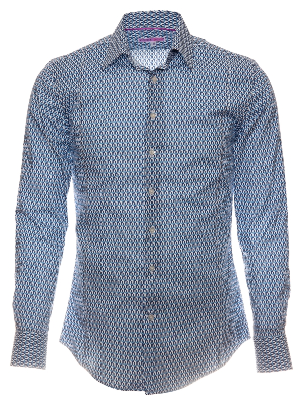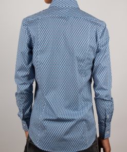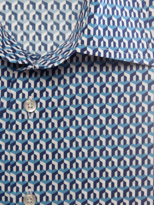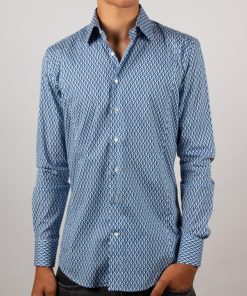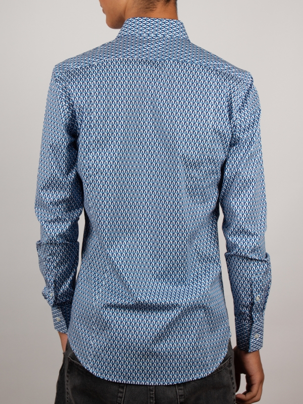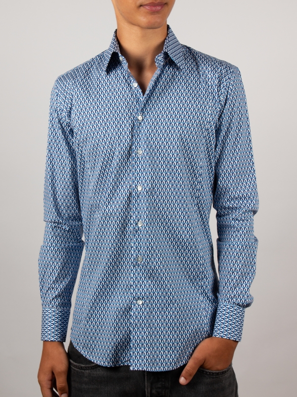 This slim fit shirt reinvents the classics with a striking geometric print in contrasting tones. The Milanese collar adds a touch of elegance, while the simple cuffs guarantee a clean finish. Perfect for lovers of sophisticated patterns, it shapes a bold silhouette with an urban and refined vibe.