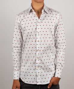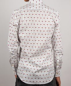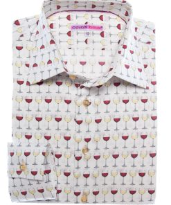 Elegance and conviviality blend seamlessly in this slim fitted shirt featuring a wine glass print. Set against a crisp white background, the delicate motifs evoke joyful moments with style and ease. The Milanese collar and simple cuffs add a polished touch to this piece, ideal for a chic yet casual look. Pair it with light-colored pants or jeans for a refined, modern outfit.