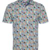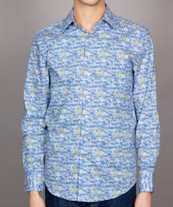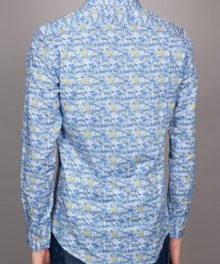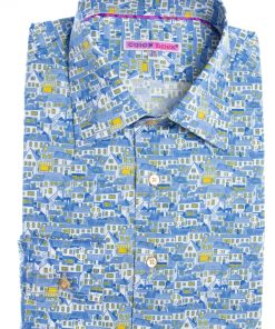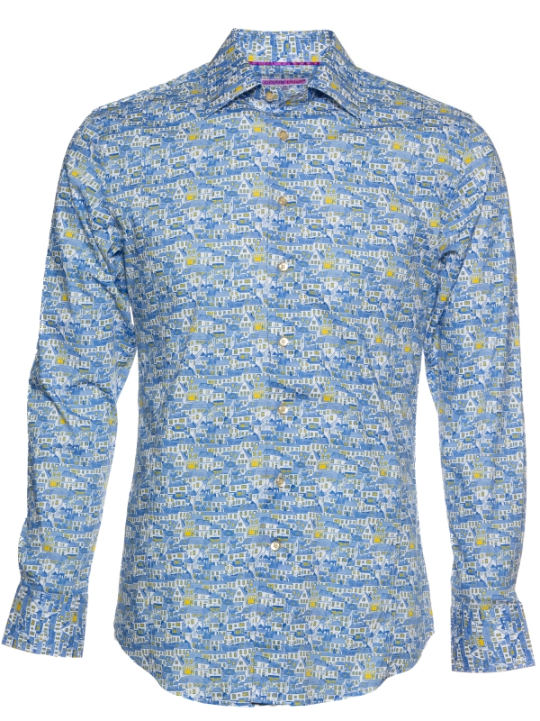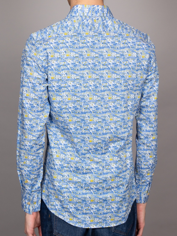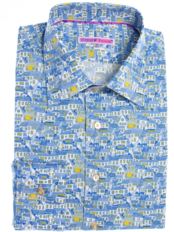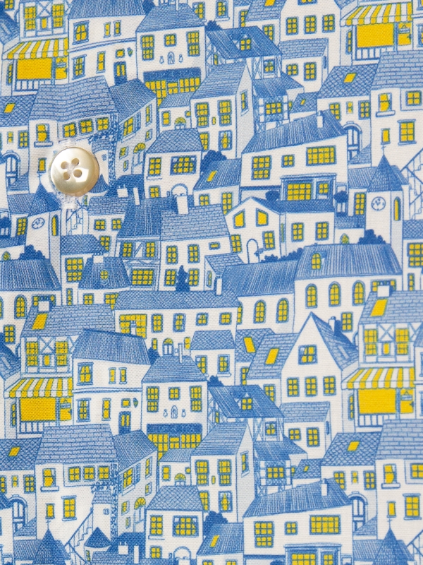 A serene nightscape comes to life on this white shirt, where charming blue houses stand as if bathed in soft moonlight. The warm yellow lights glow gently from within, capturing the quiet allure of a peaceful evening. The Milanese collar adds sophistication, while the slim fit brings modern refinement to this tranquil print. With single cuffs to complete the look, this shirt is ideal for anyone seeking a subtle yet captivating design.
