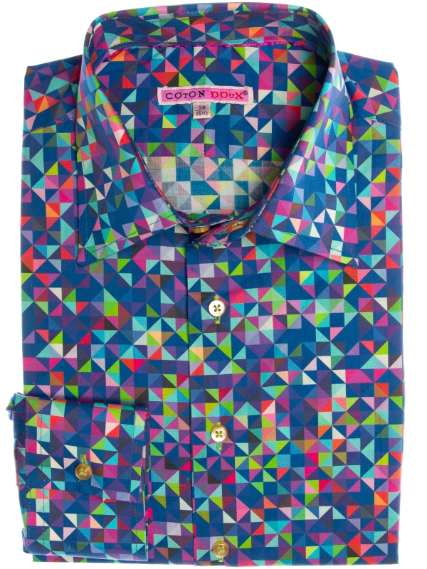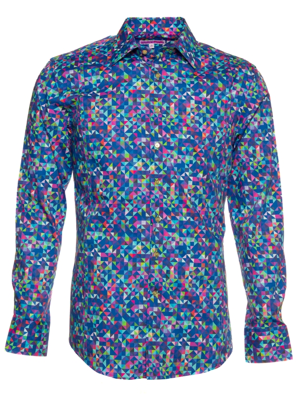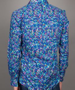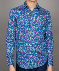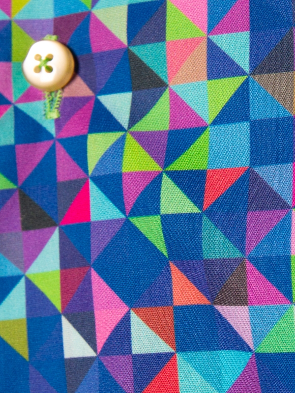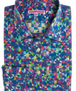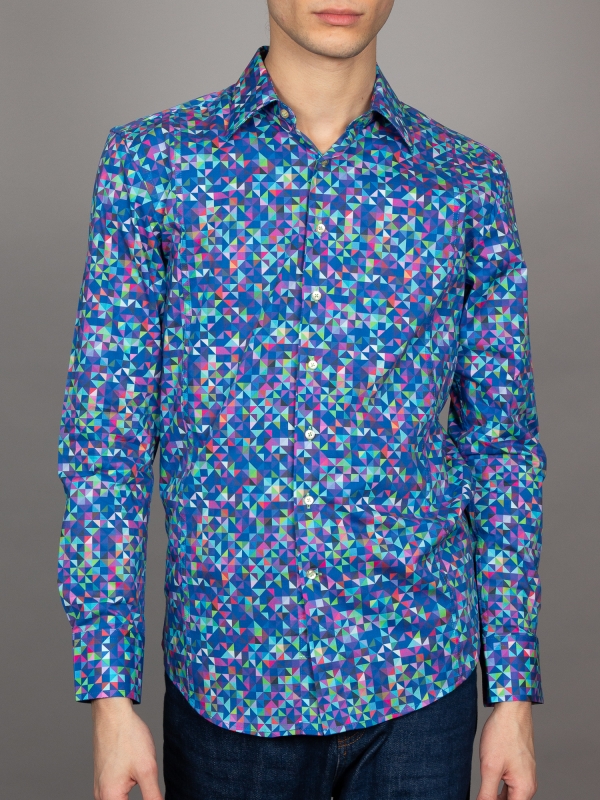 This shirt is a wearable kaleidoscope, where bold blues lead a symphony of colors in a hypnotic geometric design. Its slim fit, Milanese collar, and single cuffs ground the vibrant energy in polished craftsmanship. Pair it with navy trousers and minimalist sneakers for an outfit that’s as dynamic and unforgettable as the pattern itself ready to turn heads wherever you go.