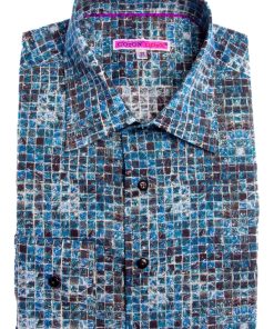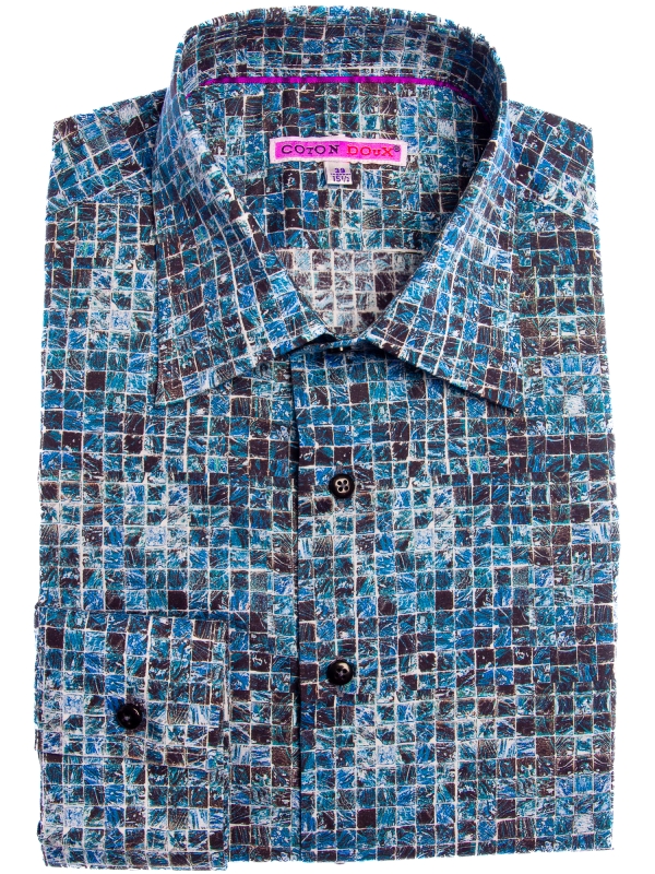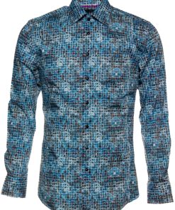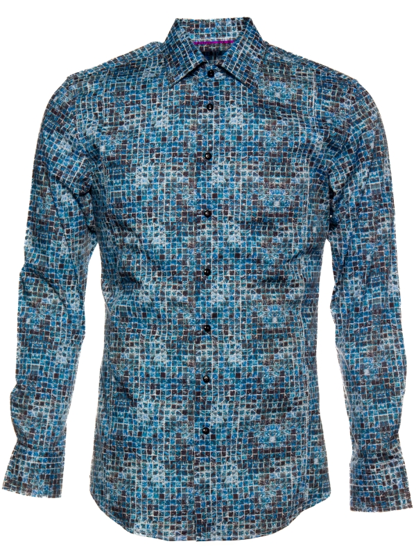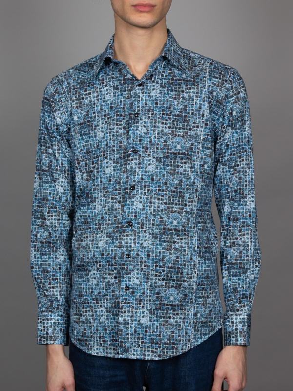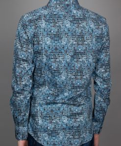 This shirt brings a burst of style with its bold blue and black mosaic print. The soft gradients between the squares give it a subtle yet captivating energy. The tailored cut fits just right, giving you a sleek, flattering silhouette, while the Milanese collar and simple cuffs keep things sharp and polished. Pair it with slim black trousers for a smooth, modern vibe, and finish off with leather boots to give the whole look a fresh, structured edge.