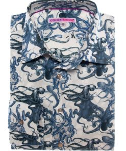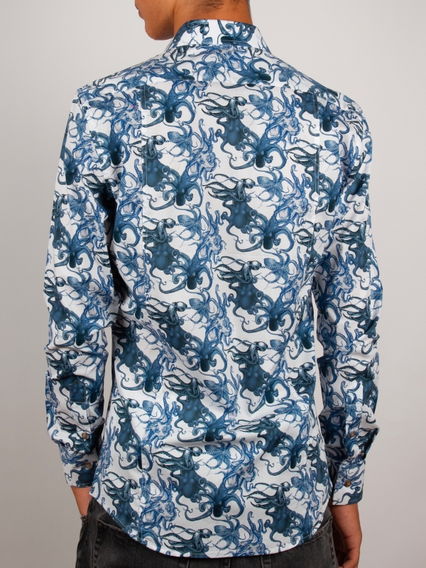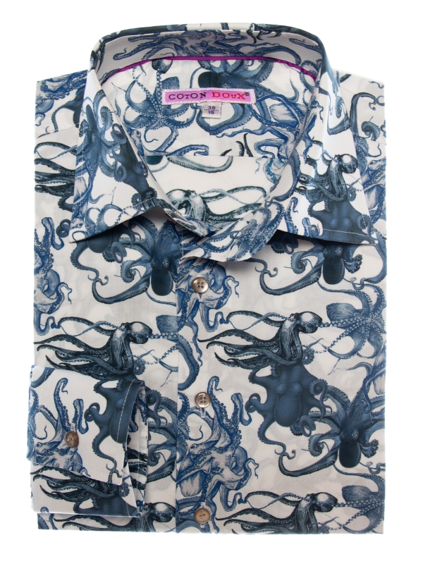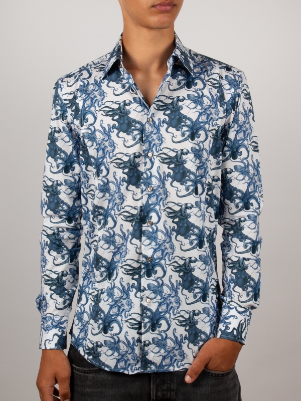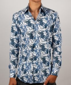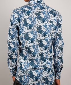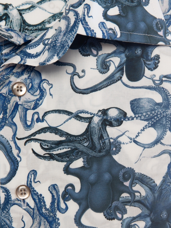 Blending originality and elegance, this slim fitted shirt features an octopus print with blue and white marine motifs inspired by the ocean’s depths. Set against a light background, the flowing designs bring freshness and mystery. The Milanese collar and simple cuffs offer a clean finish to this bold yet refined piece. Pair it with light-colored pants or jeans for a contemporary, unique look.