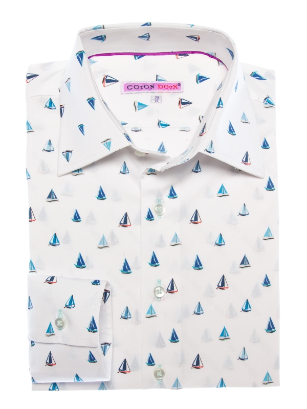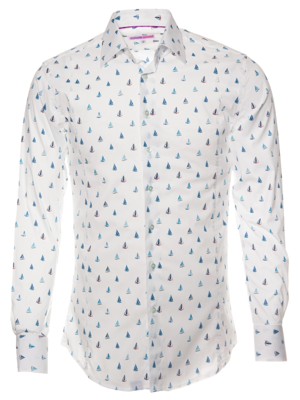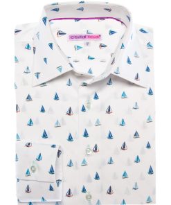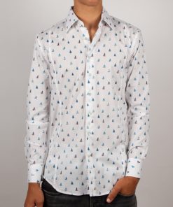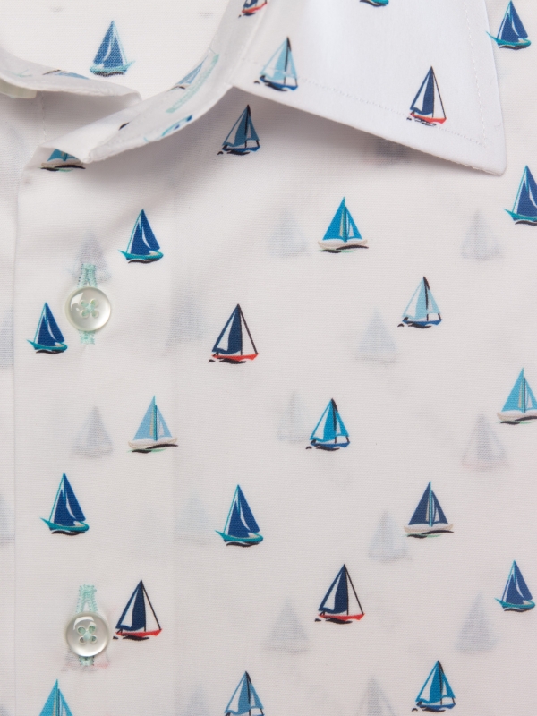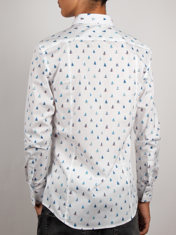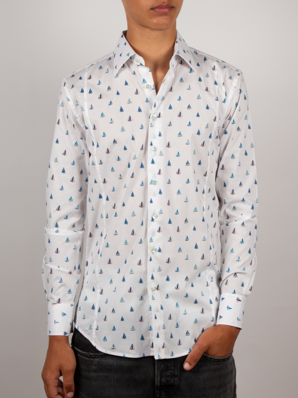 Let the breeze guide you with this fitted shirt adorned with a sailboat print, a genuine invitation to escape. Featuring a refined Milanese collar and simple cuffs, its slim fit flatters the figure with a contemporary edge. Sailboats glide gracefully across a light or navy blue background, creating a fresh and sophisticated look. Pair it effortlessly with beige chinos or raw denim jeans for a chic yet casual style.