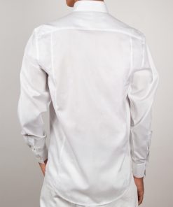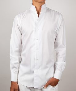Crafted from smooth, structured white poplin, this shirt blends simplicity and modern elegance. Its tailored straight cut creates a sharp silhouette, while the stand-up collar adds a refined contemporary touch. Finished with simple cuffs, the clean design offers a minimalist look without compromising on style.