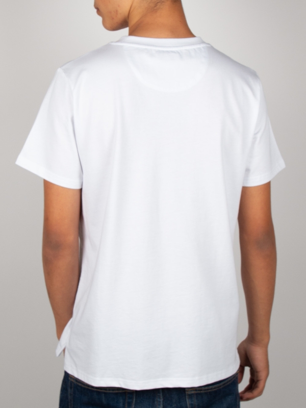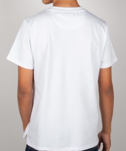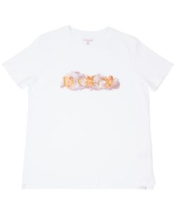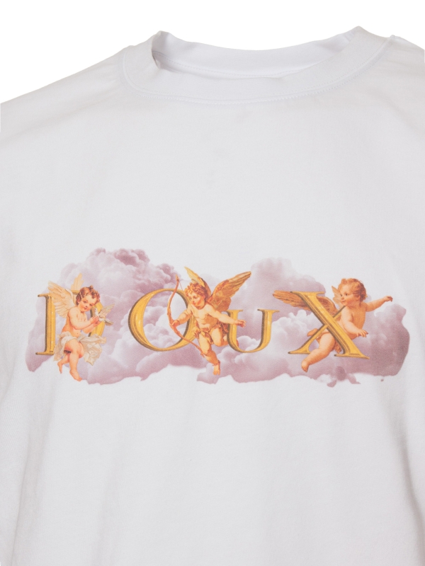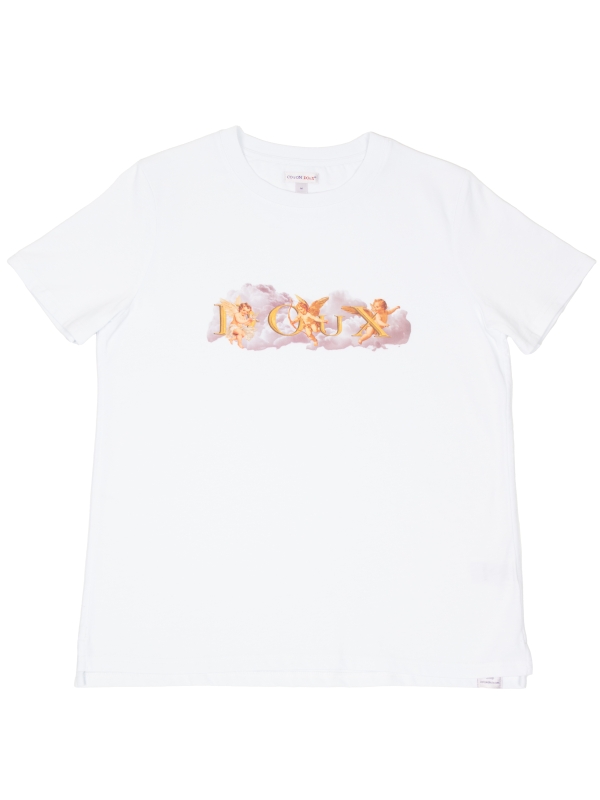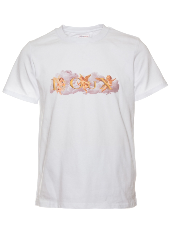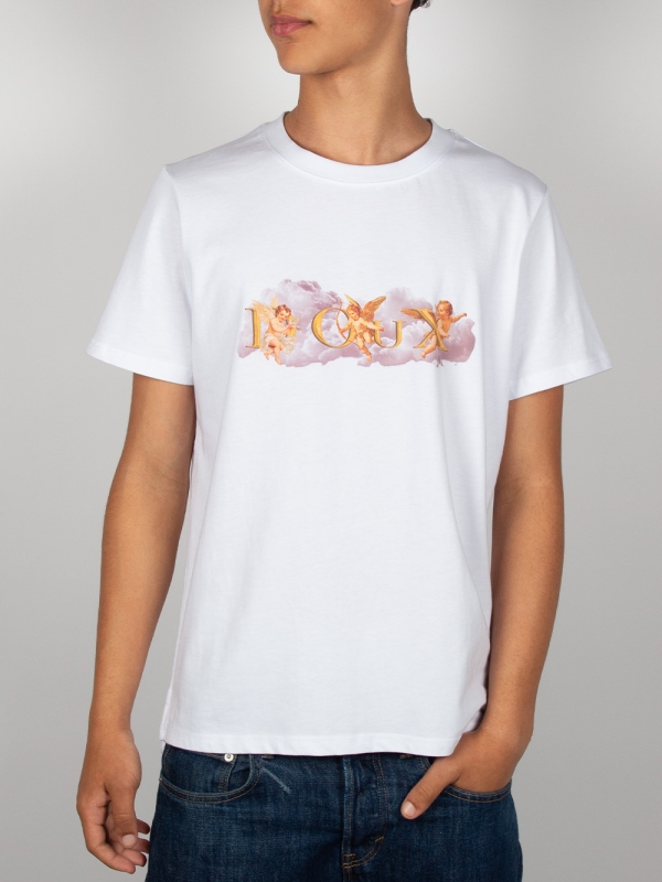 On a pure white background, this T-shirt features a central motif of cherubs floating on a cloud, adding a soft and dreamy touch. Made from mercerized cotton, it offers a unisex straight cut and a ribbed crew neck for comfort. The back neck yoke and double-needle stitching ensure a refined finish, while the side slits at the hem provide a fluid and modern silhouette.