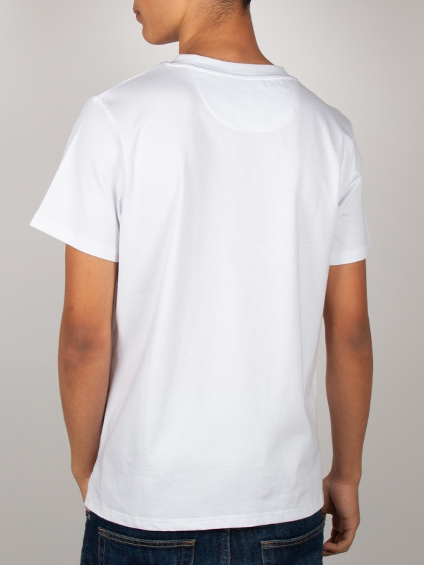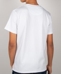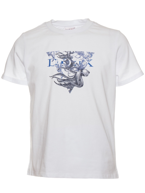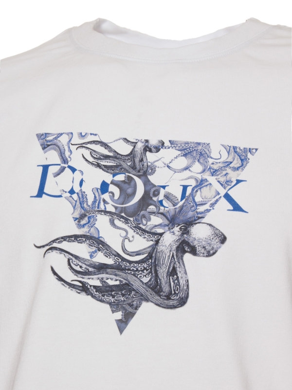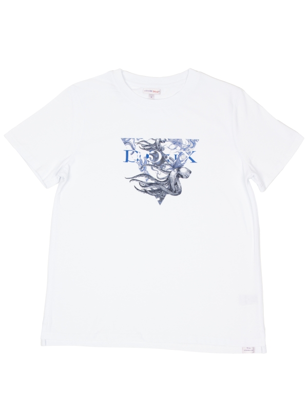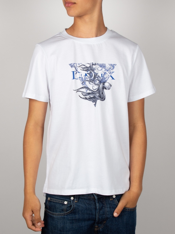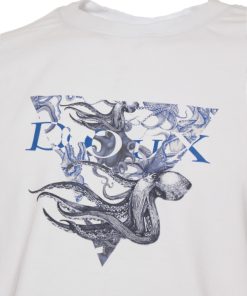 On a bright white background, this T-shirt features a stylized blue and white octopus framed by a striking triangular design. Made from mercerized cotton, it combines softness and durability. Its unisex straight cut, ribbed crew neck, and back neck yoke ensure perfect comfort. Side slits and double-needle stitching complete this modern and bold design.
