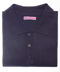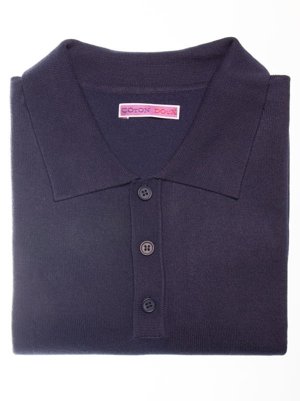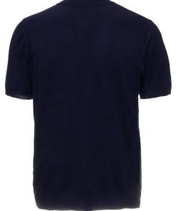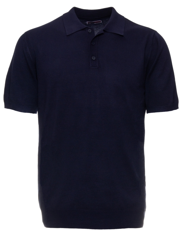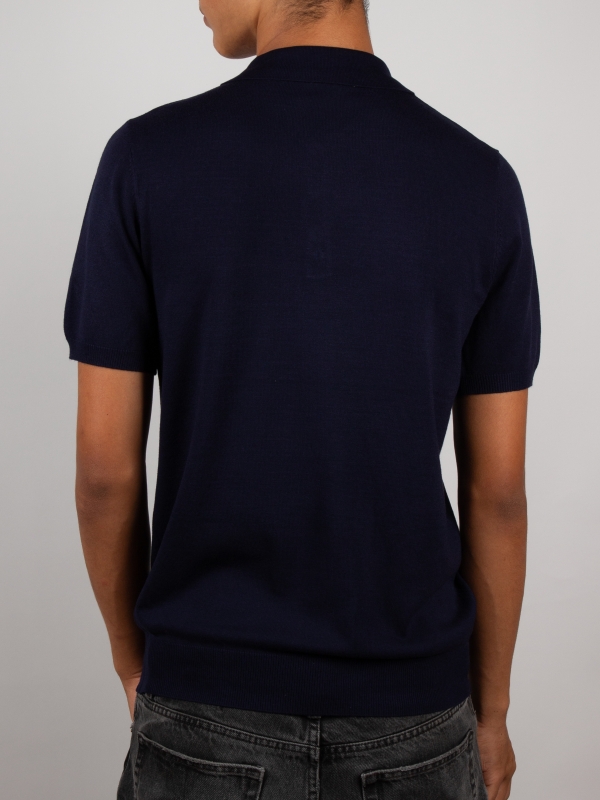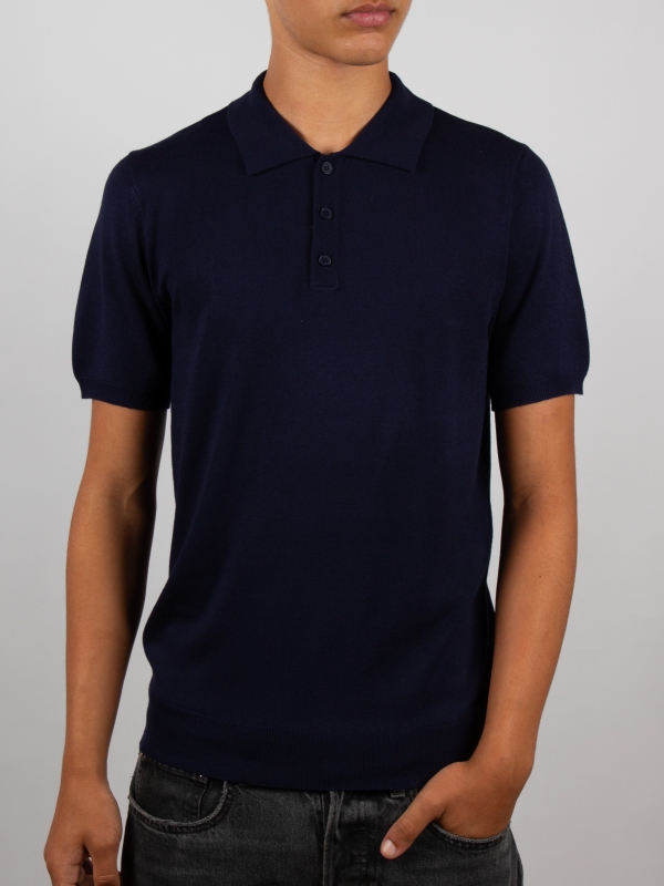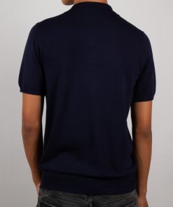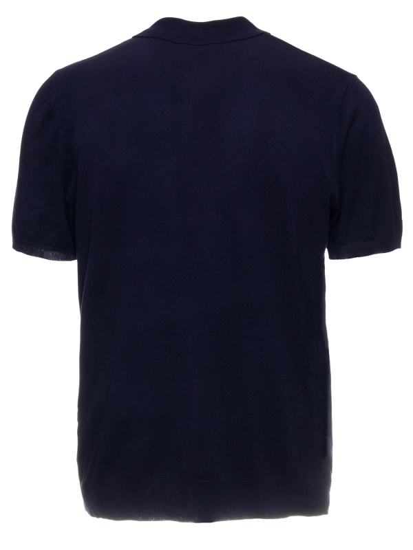 This blue knit polo features a regular fit, a classic collar, and a three-button placket, adding a fresh, breezy touch to your summer wardrobe. Effortlessly refined and perfect for sunny days and relaxed looks.