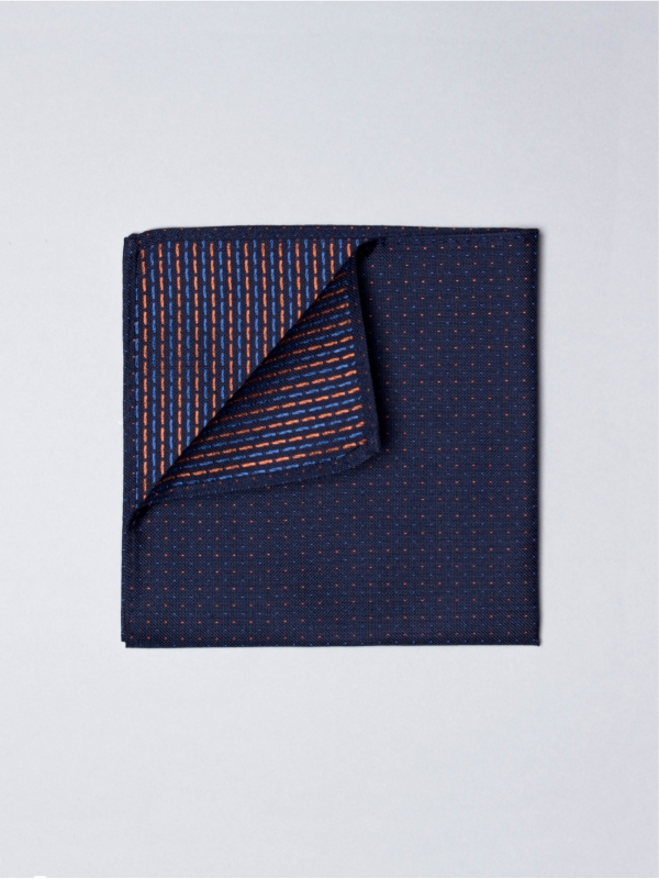 To enlighten your suits, stop looking and adopt this navy silk pocket with micro orange dots. You will wonder how you ever did without it.