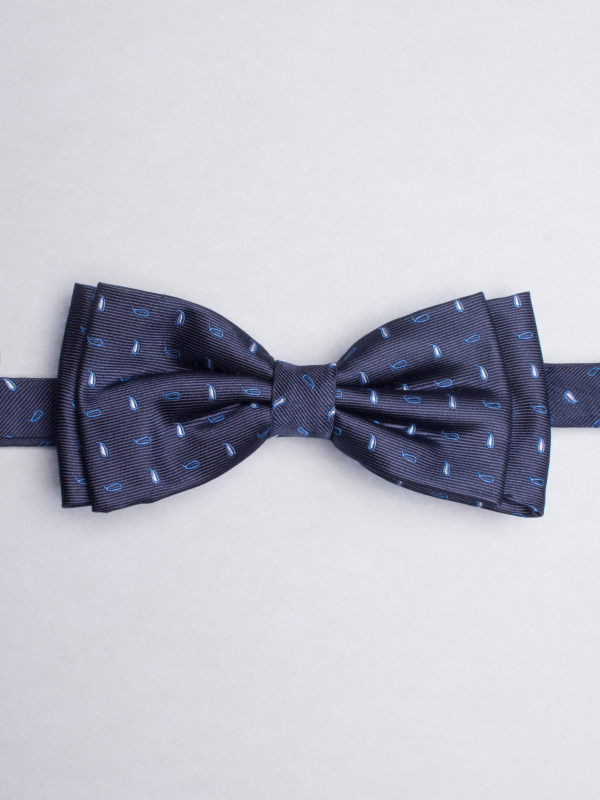 This blue bow tie with cashmere patterns will match with a black or grey suit. About the shirt, two possibilities: white, or light blue, in both cases the result is the same: elegance and sophistication.