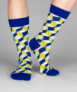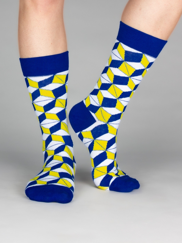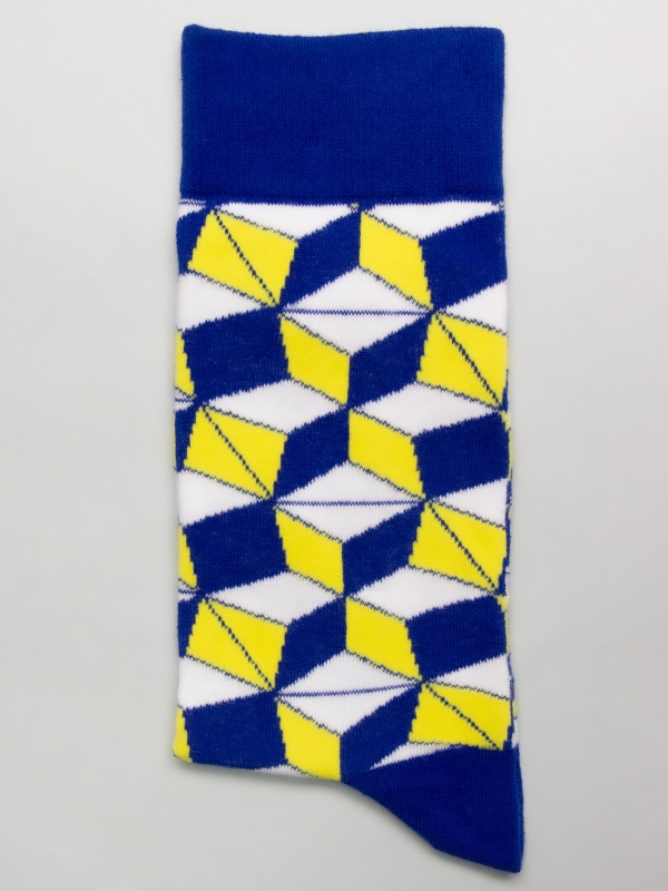 Step into a geometric dream with these socks featuring a captivating 3D cube pattern. As you move, the cubes seem to shift and dance, creating a mesmerizing visual play that adds depth and dimension to your style. Let every step be a journey through a world of spatial wonder.The model wears a size 38-41.