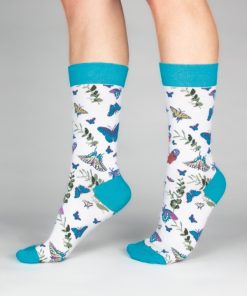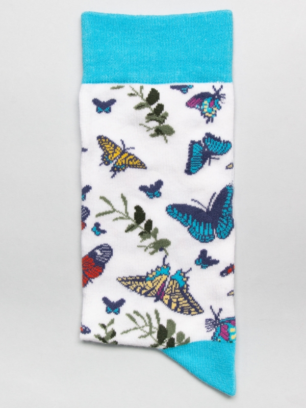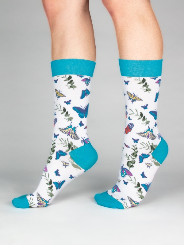 Glide through your day with these enchanting socks adorned with a delicate butterfly pattern. Each fluttering design captures the essence of grace and transformation, turning your every step into a dance of elegance and whimsy. Its mainly cotton composition makes it an essential accessory during your weekends in the countryside.The model wears a size 38-41.