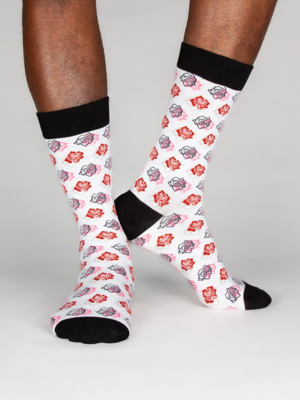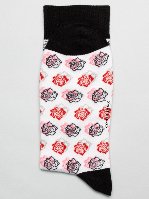 Step into a garden of elegance with these socks adorned in a rose pattern. Each pair blooms with timeless charm, infusing your every step with a touch of floral grace and romantic allure. Your look will remain discreet under your jeans, chinos, or any other black pants.The model wears a size 42-46.