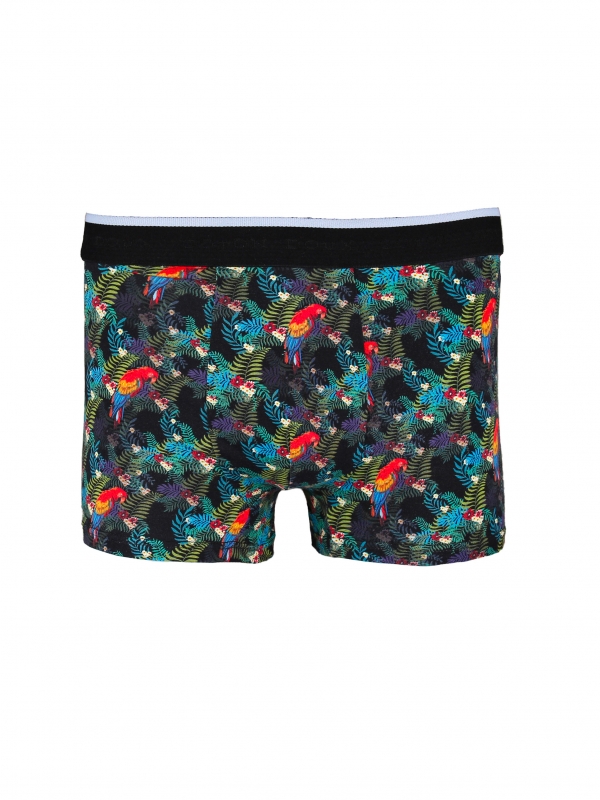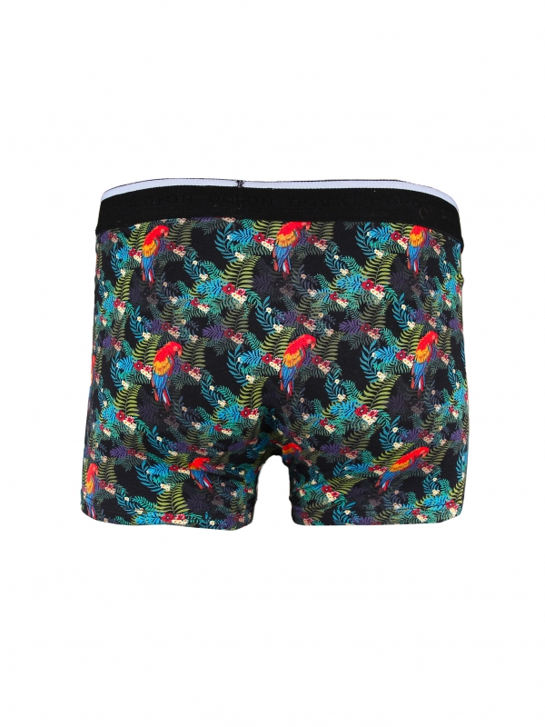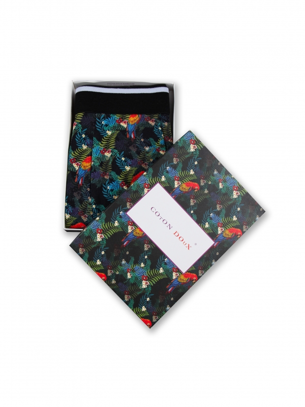 These tropic color parrot print trunks are definitely inspired by the jungle. Accented with beautiful brightly parrot in the background of foliage and flower with black comfort elasted logo waistband. Get the most ease of movement and relaxation in this underwear made of cotton and elastane.