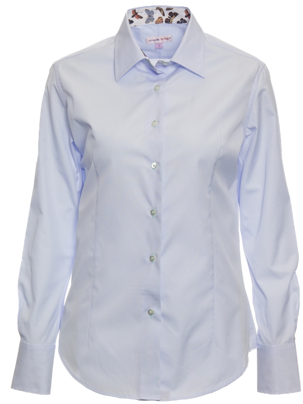 Elevate your wardrobe with this blue poplin fitted shirt, hiding a delightful surprise within a vibrant butterfly inner lining that feels like a secret garden. Designed for a flawless fit, it flatters your silhouette while adding a playful edge. Perfect for the office or a casual outing, it can be paired with tailored trousers or denim.