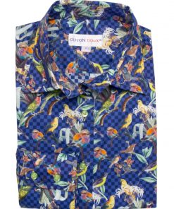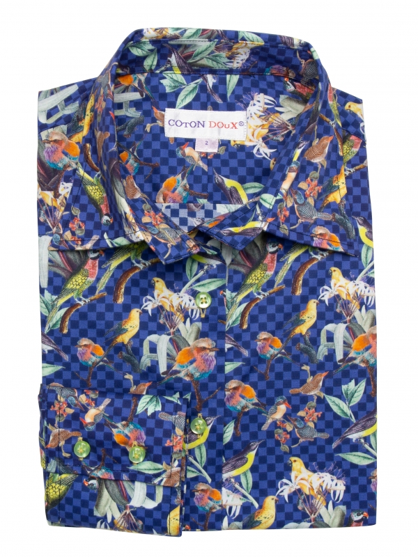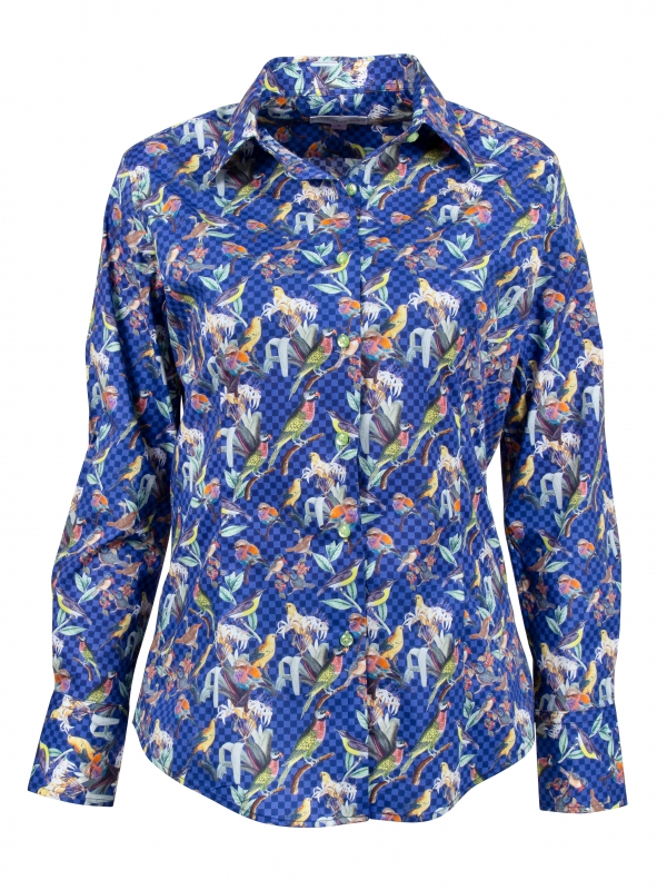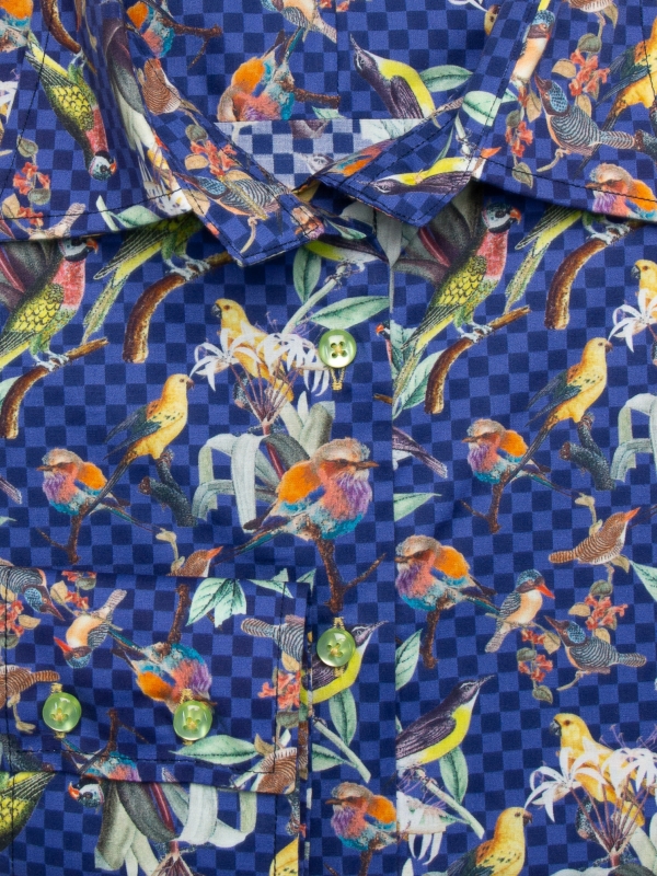 Take flight effortlessly with this bird-print shiert on a blue checkerboard background, adding a touch of magic to your wardrobe! Adorned with a classic collar and double-button cuffs, offered in a tailored fit, it encompasses all the elements of a future wardrobe essential. Pair it with a gray wool pencil skirt for elegance and high black leather boots for a sophisticated look. Poetic, chic, and hypnotic, words will not be in short supply during your captivating journey and wild takeoff.