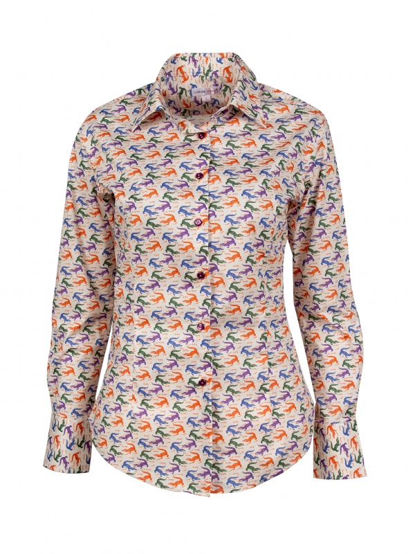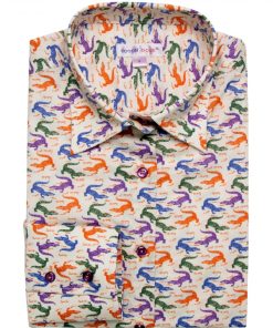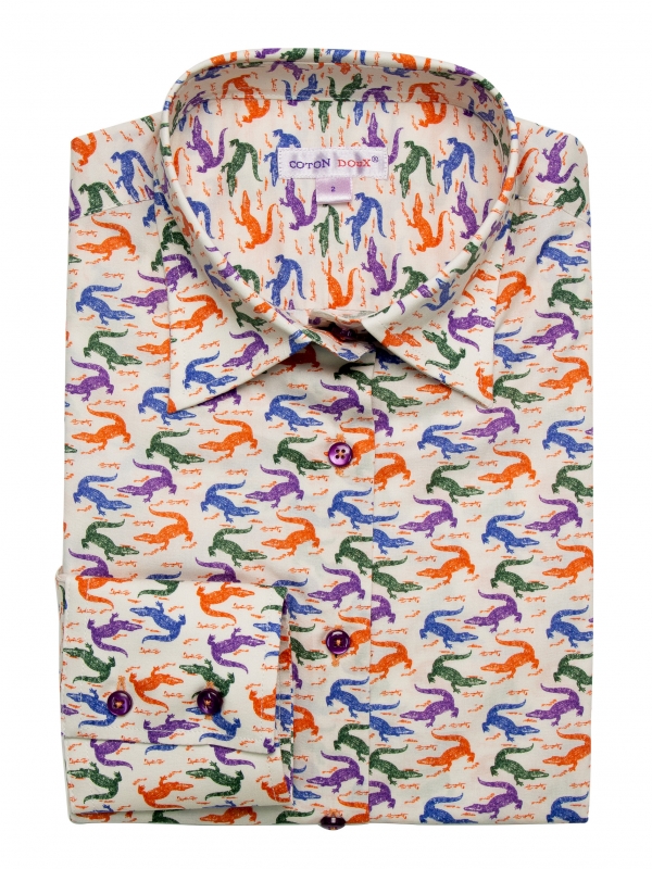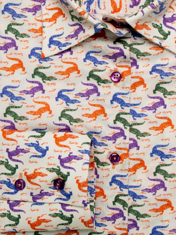 The classic collar and sharp double-button cuffs provide a clean foundation for this slim-fit shirt. But the true journey begins with the captivating ccaimans print. Channel your inner explorer with khaki chinos, brown desert boots, and a linen blazer in a complementary neutral tone. Top this crocodile printed shirt with a fedora hat for a touch of adventurous safari chic.The print creates a tactile and visual feast, ready to be explored.