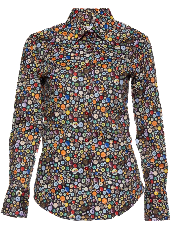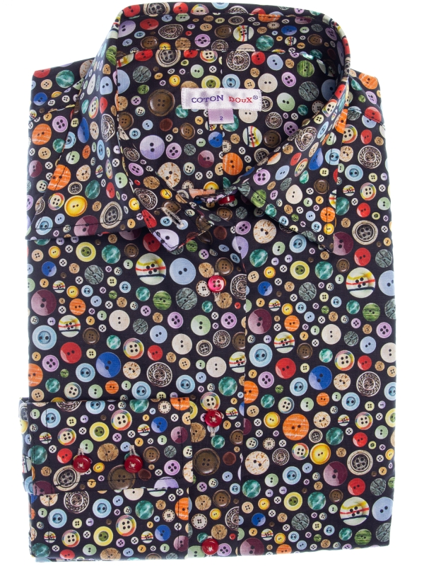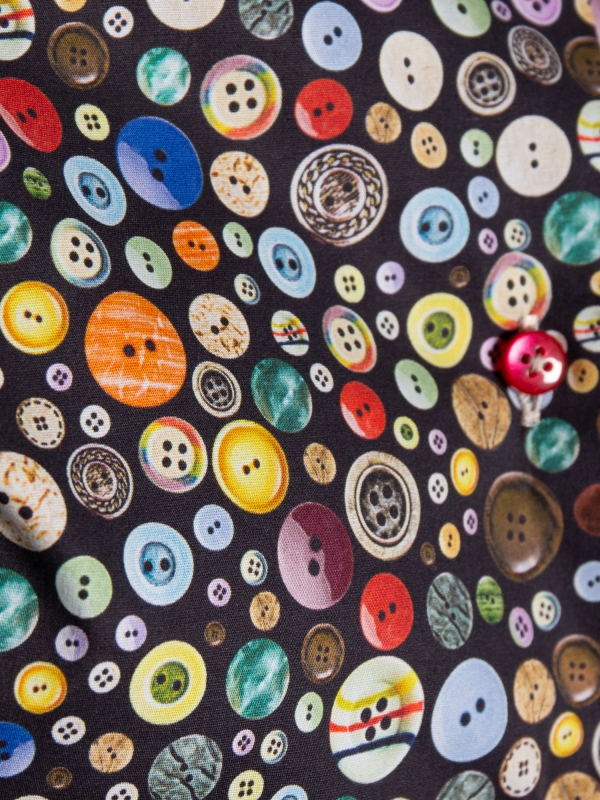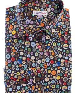 Add a touch of playful artistry to your wardrobe with this shirt, featuring vibrant multicolored buttons against a bold black canvas. The design exudes creativity and energy, enhanced by a classic collar, double-button cuffs, and a sleek slim fit. This perfect fusion of lively detail and modern sophistication makes it a standout piece for those who love to mix style with individuality.