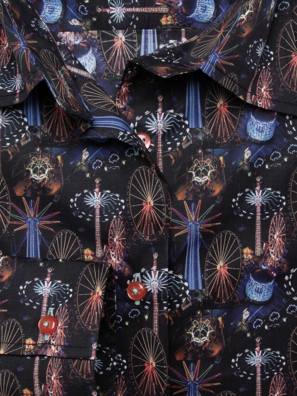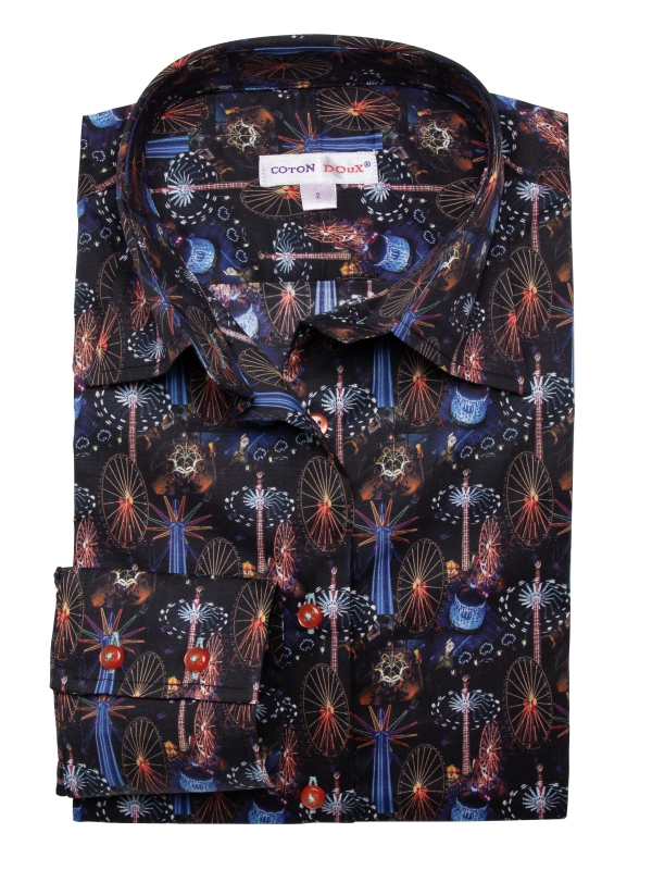 Step into the vibrant energy of a carnival with our funfair print shirt, where every detail exudes whimsy and joy. The lively funfair print captures the essence of celebration, while the classic collar and double-button cuffs add an element of sophistication. Crafted in a slim fit, this shirt offers a modern and tailored look. Pair it with beige chinos and loafers for a versatile outfit that’s perfect for playful days. Embrace the spirit of festivity with this unique and stylish shirt.